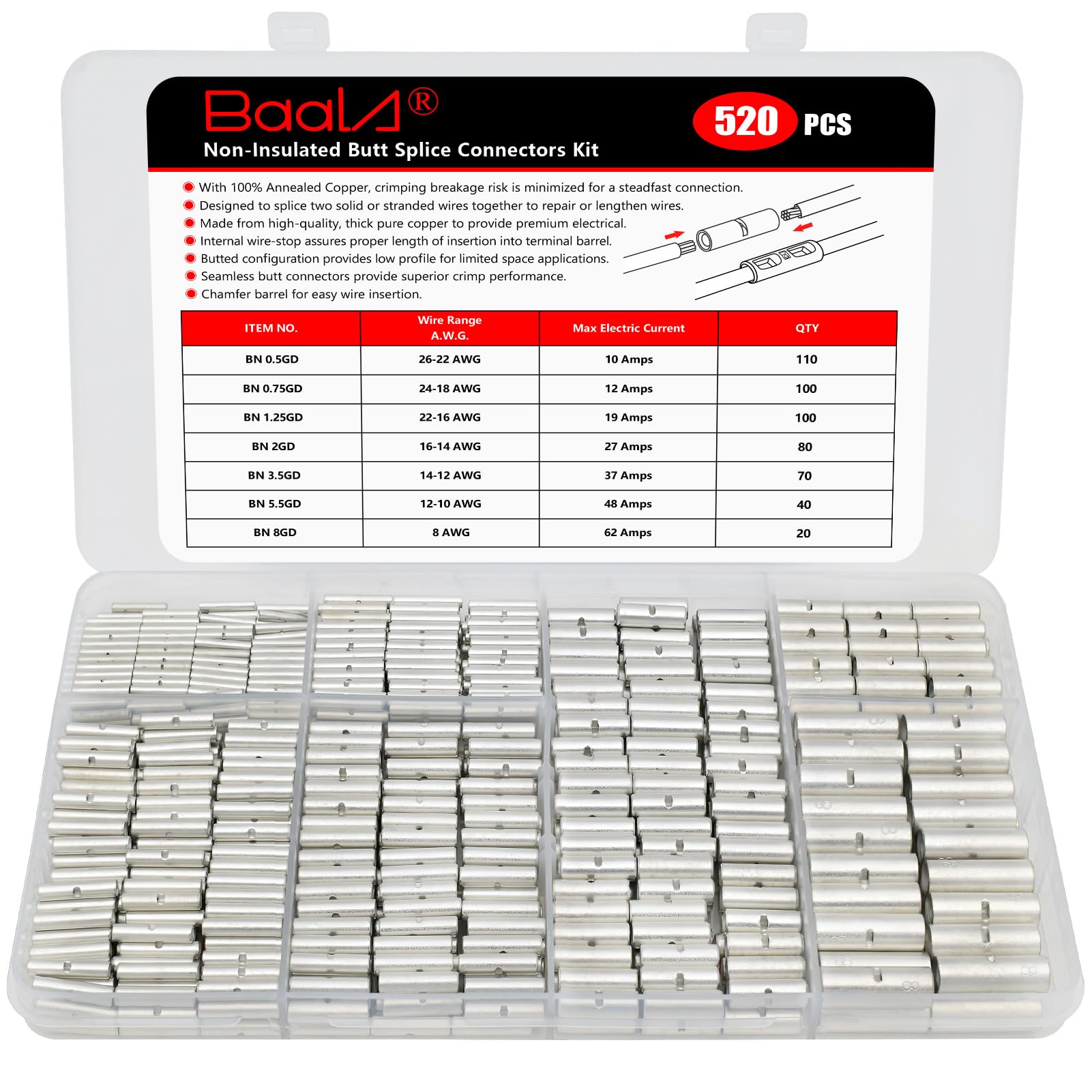 BAALA Kit de 520 conectores a tope no aislados, cobre estañado, conectores de alambre de crimpado de empalme a tope de calibre 26-