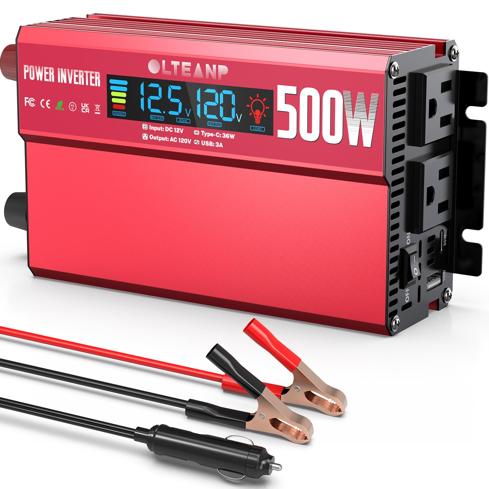 Inversor de corriente de 500 W con pantalla LCD, 2 salidas de CA, puerto tipo C de 36 W, puerto USB de 5 V/3 A, inversor de 12 V C