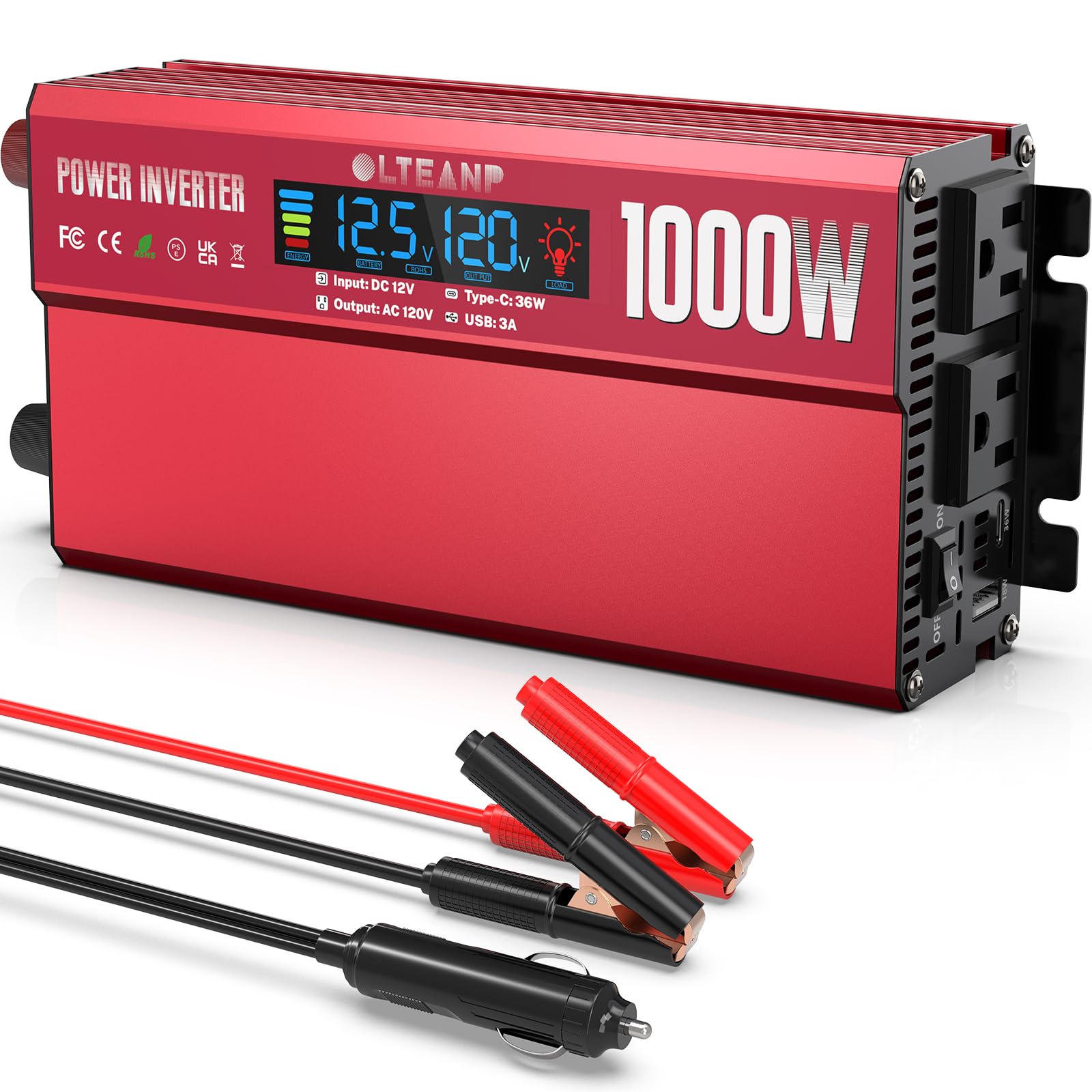 Inversor de corriente de 1000 W con pantalla LCD, 2 salidas de CA, puerto tipo C de 36 W, puerto USB de 5 V/3 A, inversor de 12 V