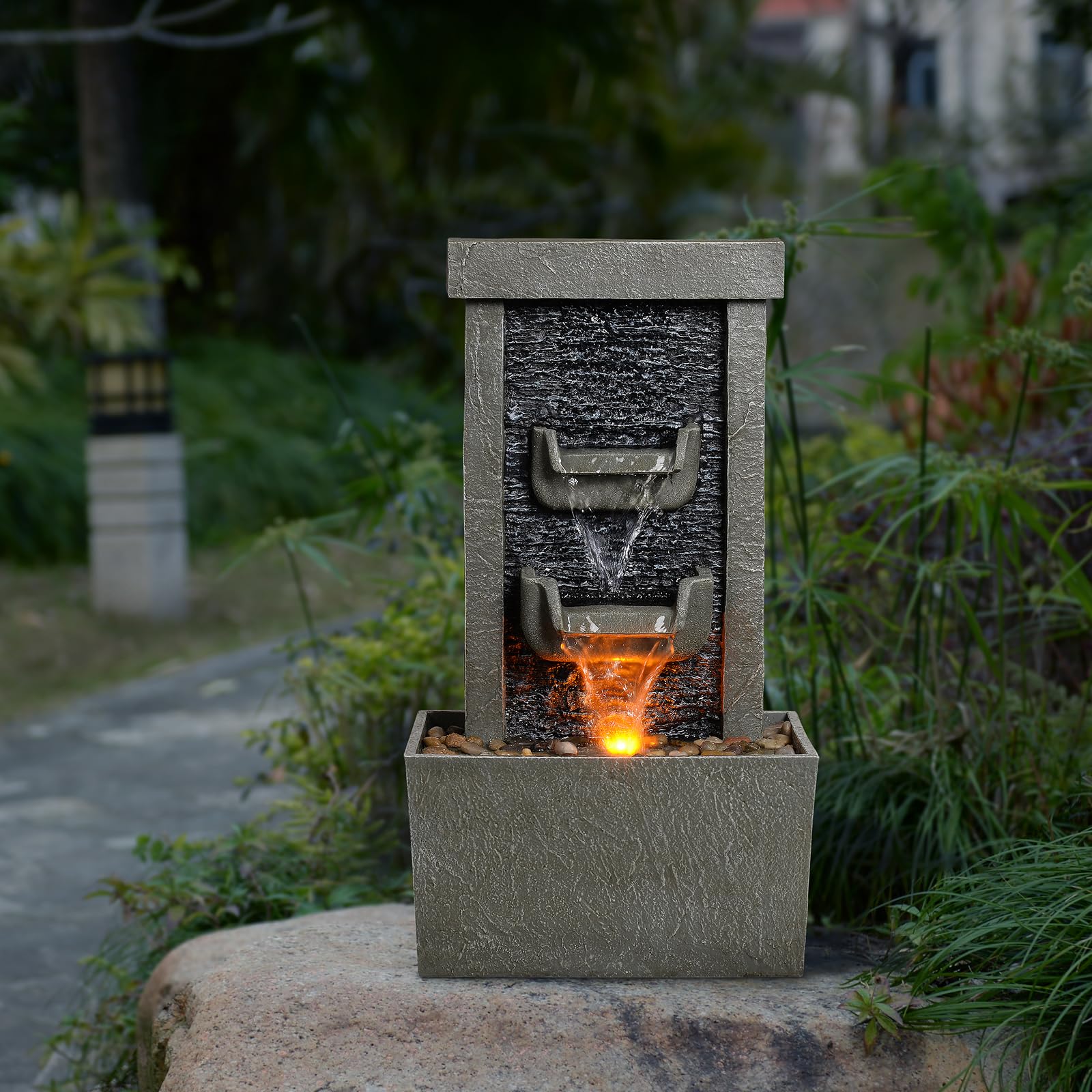 Fuente de agua de resina para exteriores con luces LED, moderna fuente escalonada para jardín, patio, decoración de cascada, 23.6
