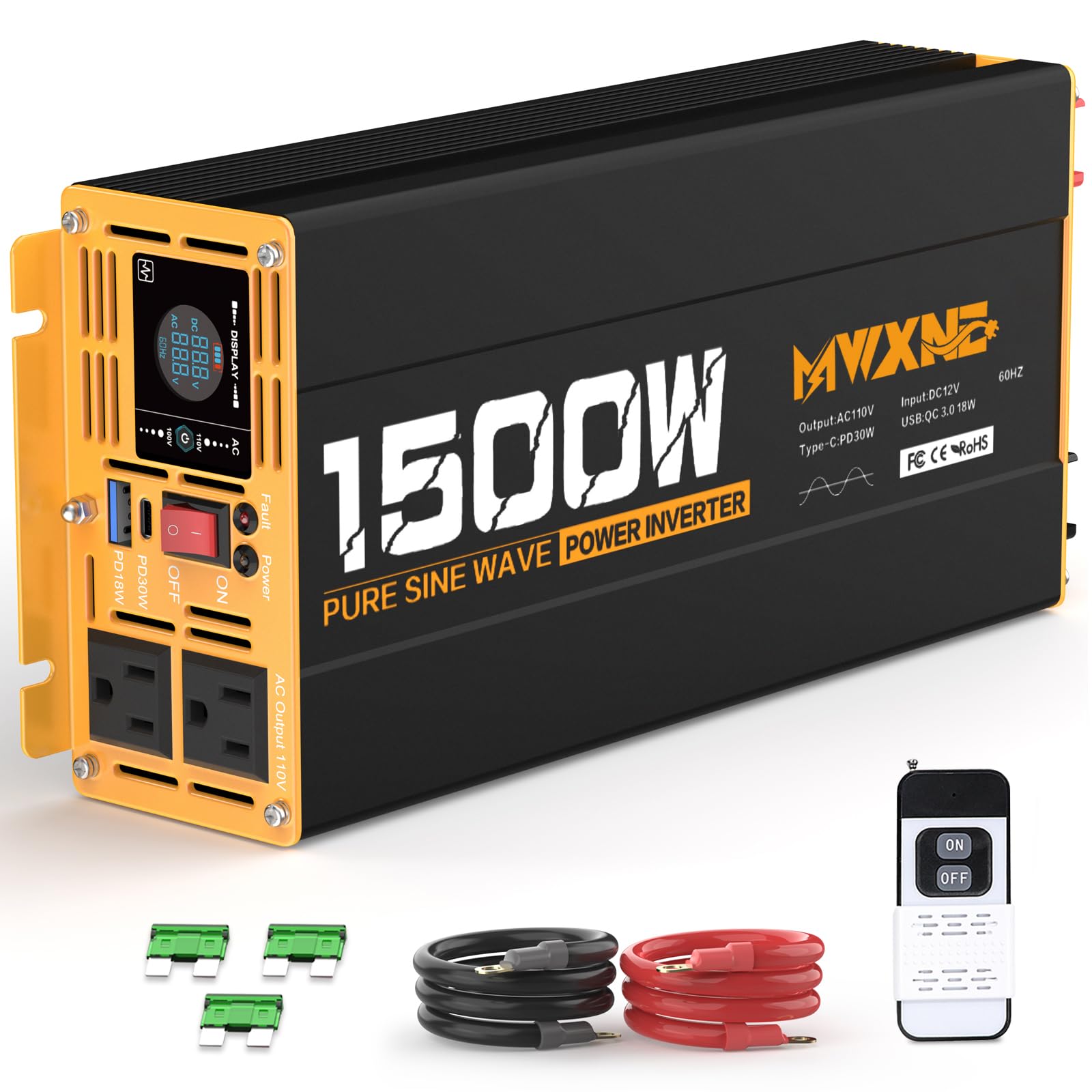 Inversor de corriente de onda sinusoidal pura de 1500 W, convertidor de CC 12 V a CA 110 V 120 V con 2 salidas de CA, QC3.0 18W US