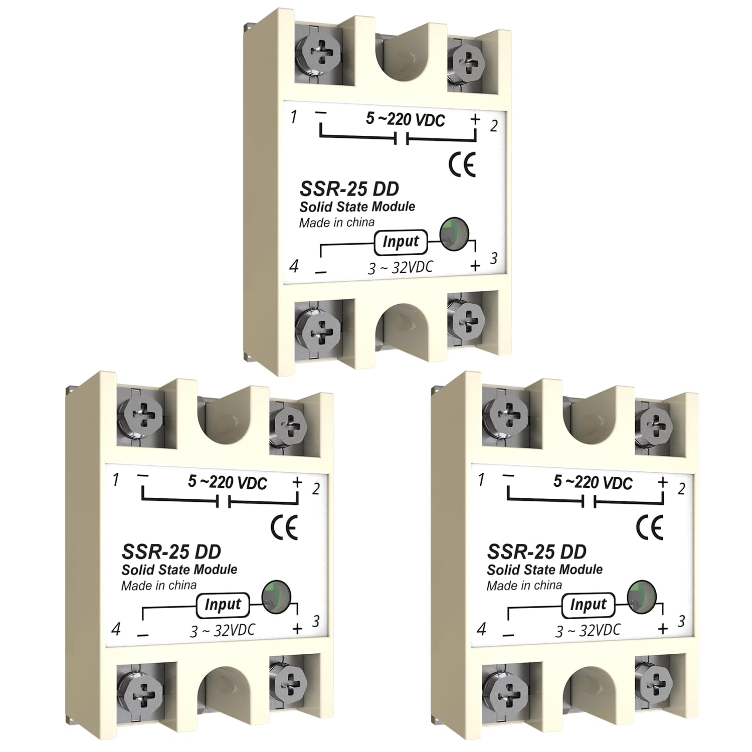 MAKERELE SSR-25DD 25A Relé Monofásico Semi-Conductor Módulo de Relé Entrada 3-32V DC Salida 5-220VDC (Rack de 3)