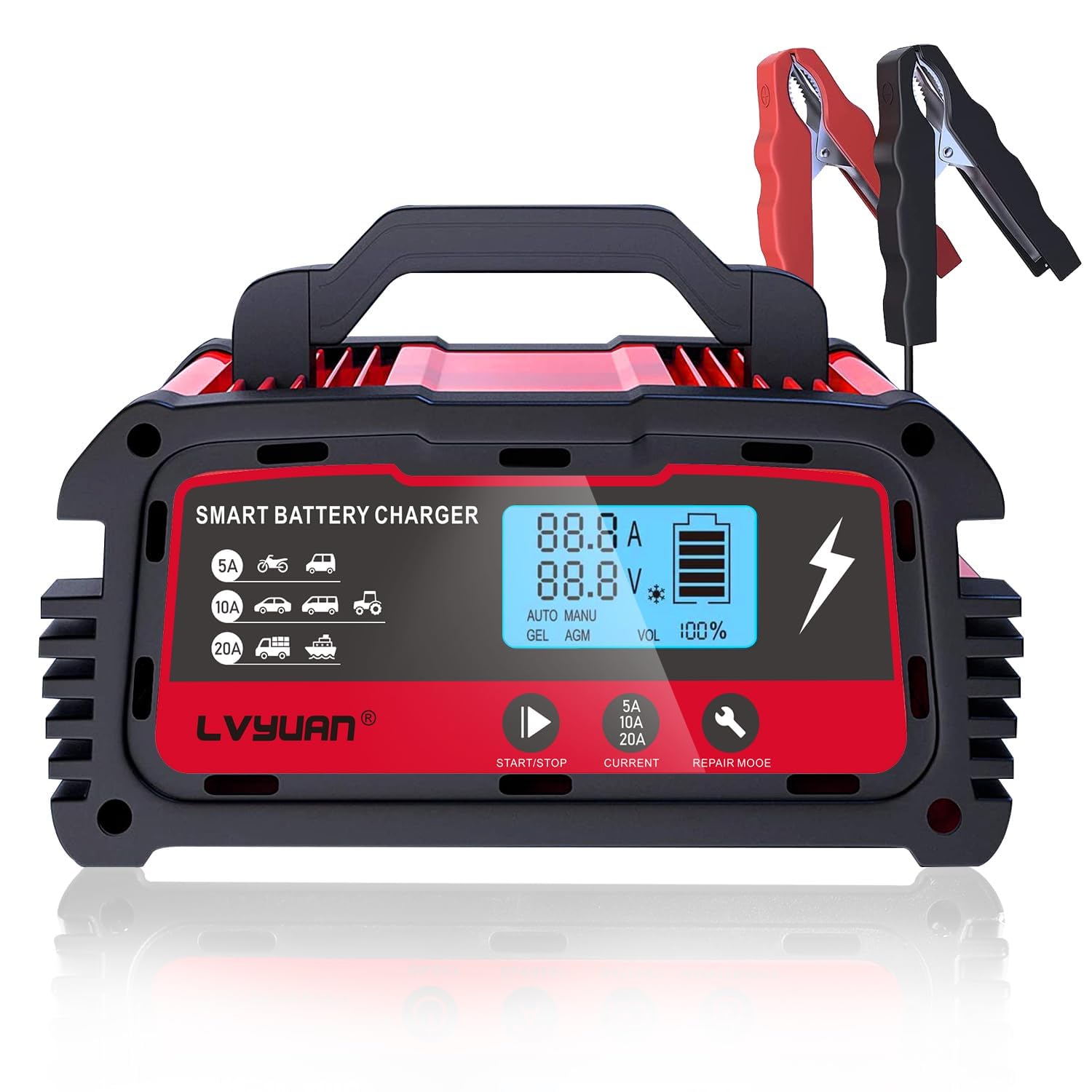LVYUAN Cargador de batería inteligente de automóvil de 20 A, 12 V (5/10/20 A) y 24 V (5/10 A), cargador automotriz para motociclet