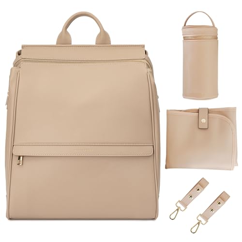 Mochila de cuero para pañales con puerto de carga USB, cambiador, correas de cochecito y soporte para botellas (Beige Sofía)