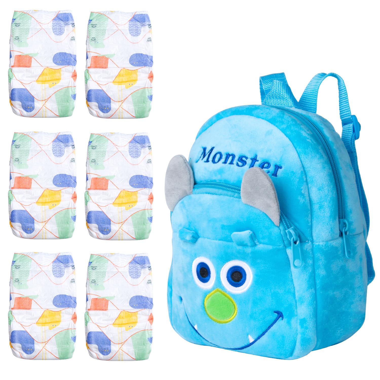 Reborn Baby Doll Diapers 6 Pieces for 17-22 Inch Reborn Dolls Reusable Diaper Bag Blue Backpack Large Capacity (Monster)