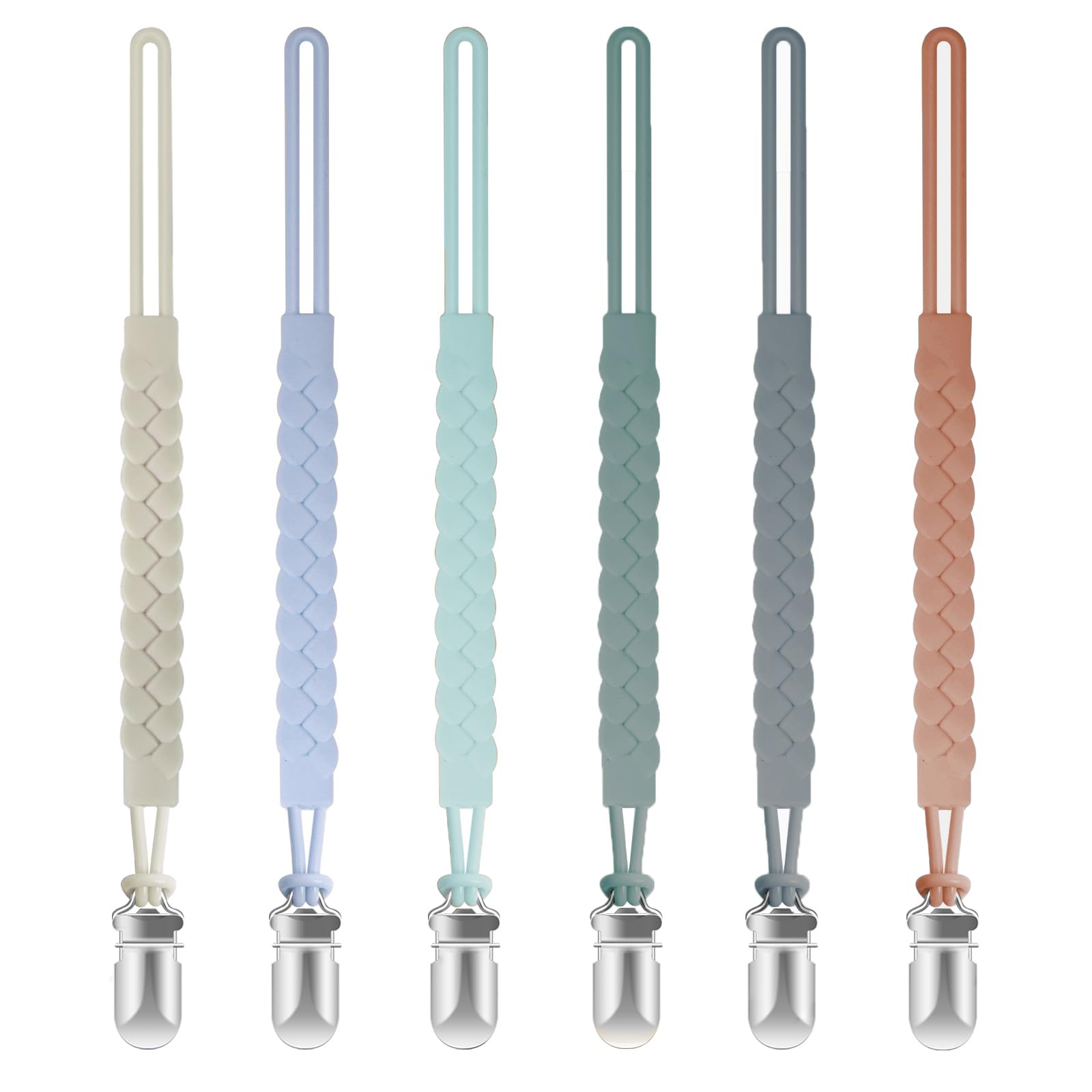 TenderBabe Clip de silicona para chupete para bebés niños y niñas, paquete de 6 clips suaves y flexibles con diseño trenzado de un