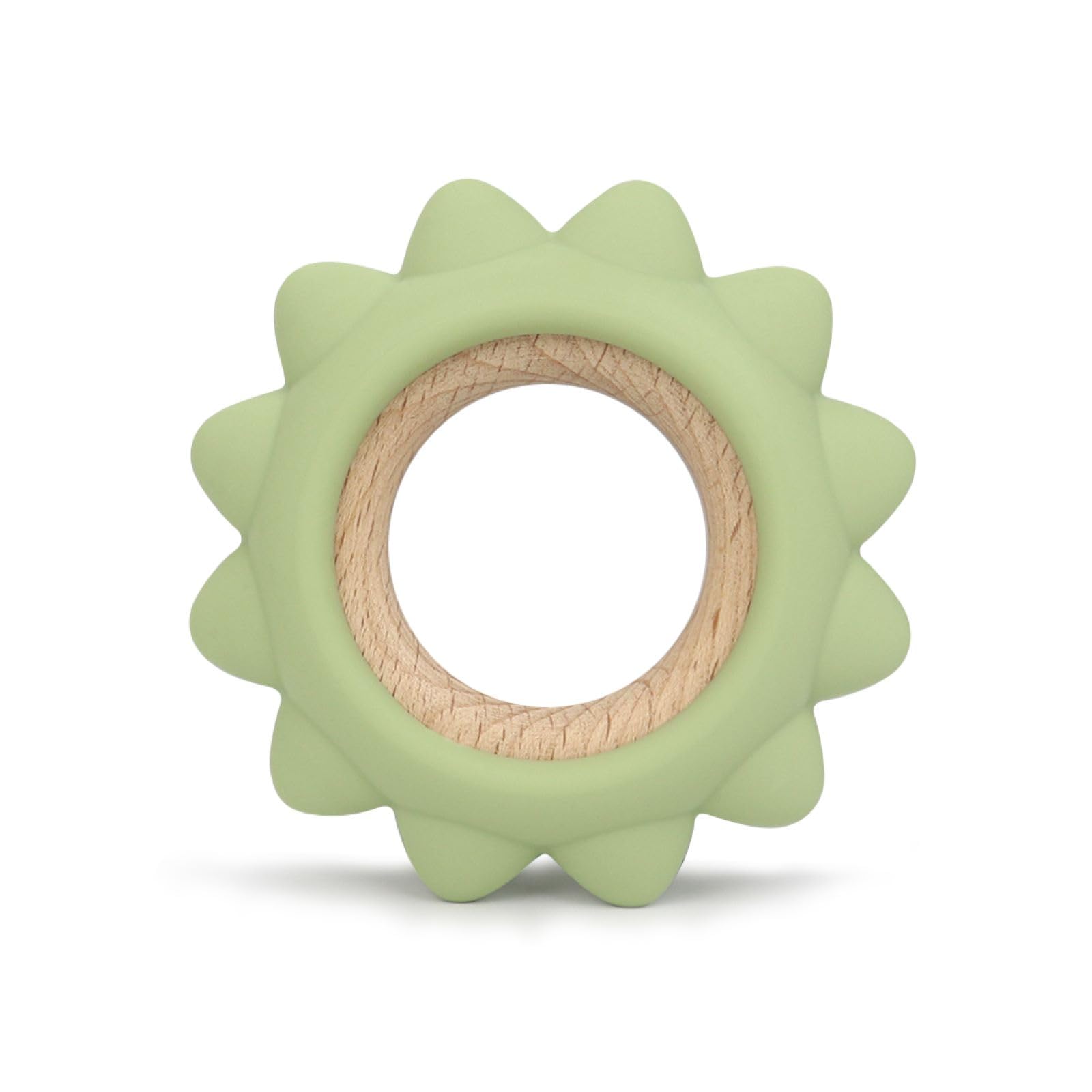 Juguetes de dentición para bebés, mordedores de silicona con anillo de madera, juguetes sensoriales (verde sol)