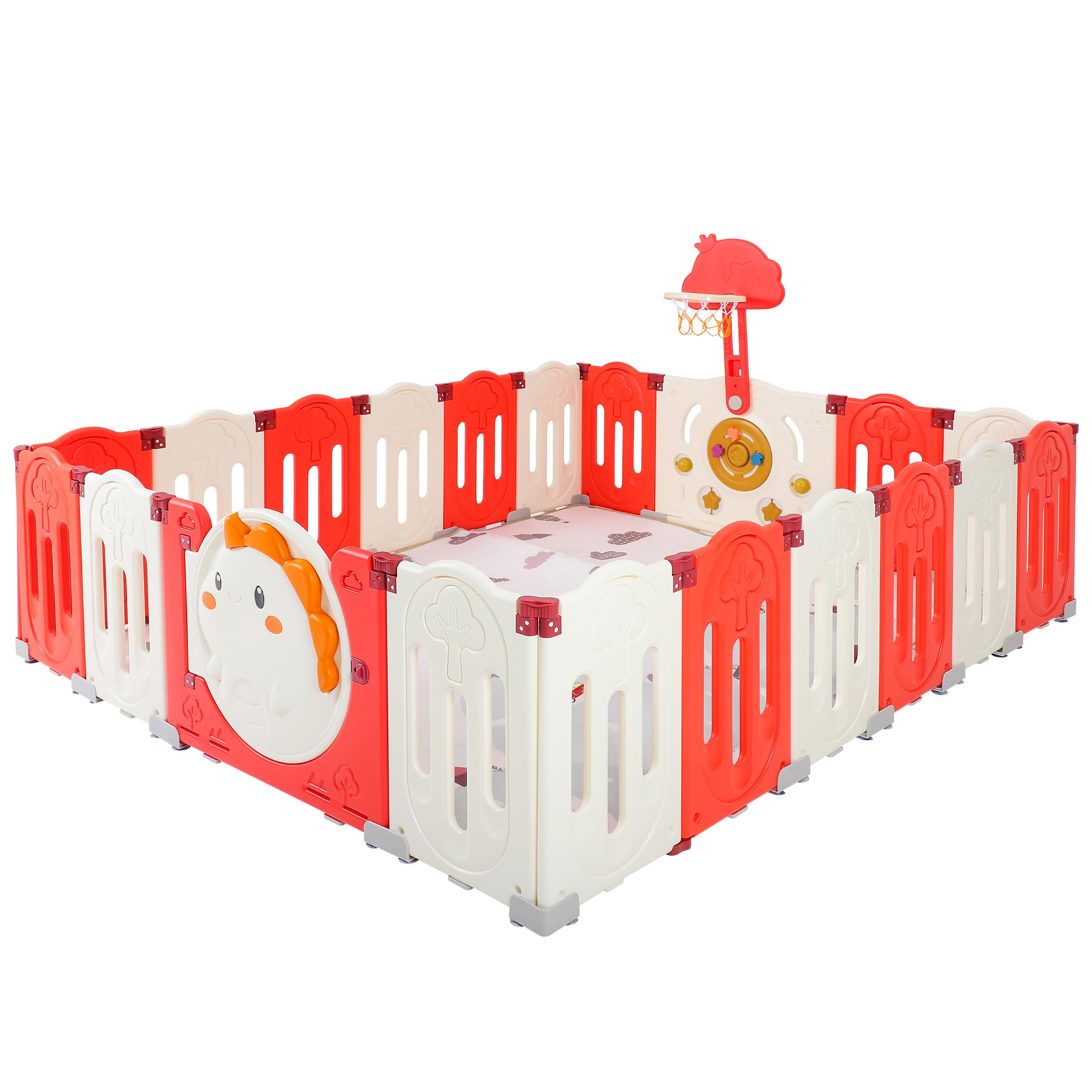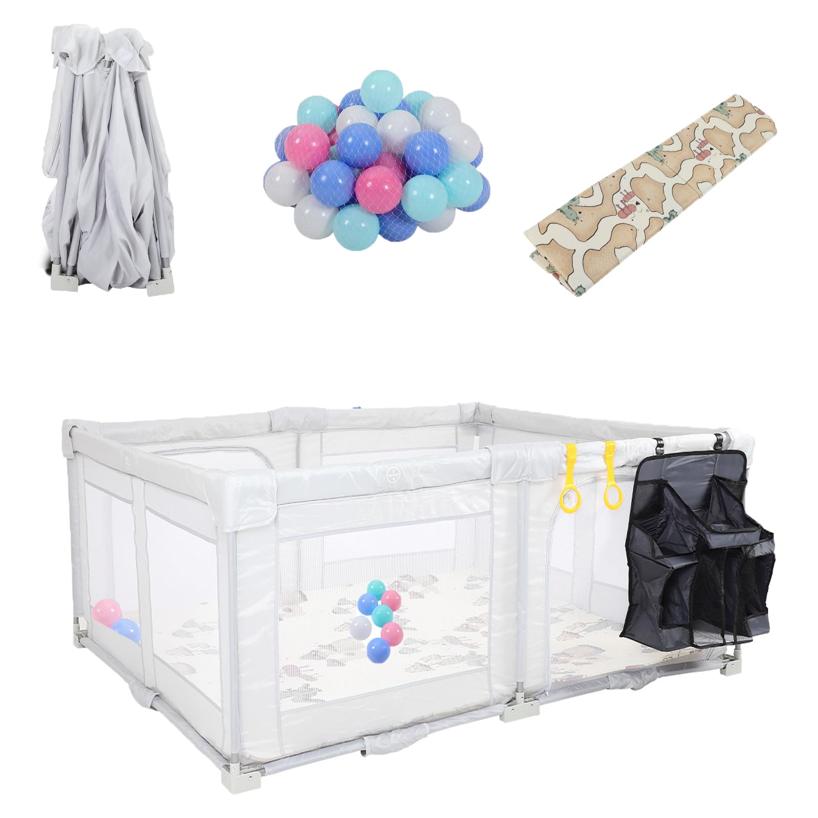 Corralito de juegos de dibujos animados para bebés, con alfombrilla para gatear, soporte de baloncesto y 100 pelotas oceánicas, co