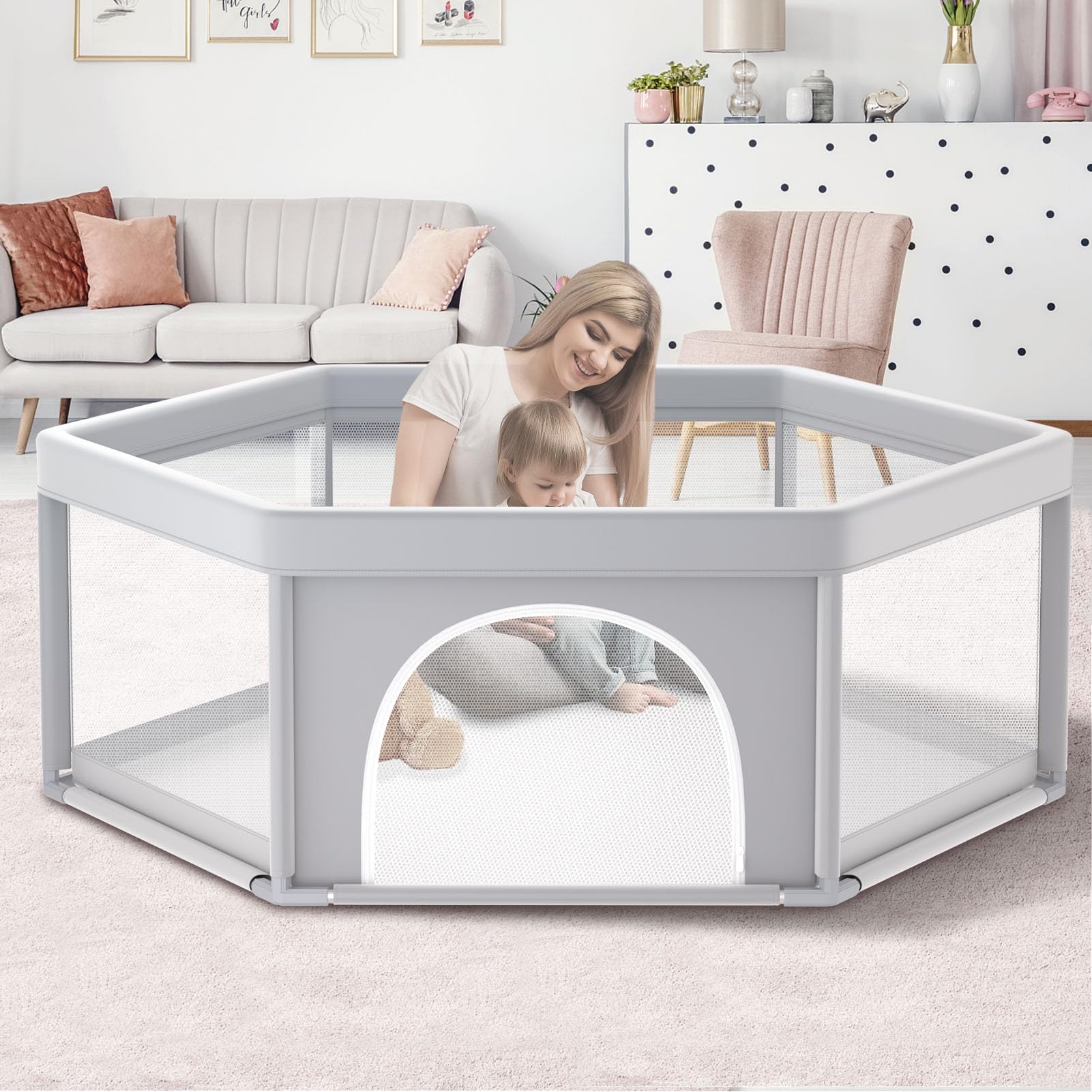 Corralito para bebés, corralito hexagonal de 65 x 65 pulgadas para bebés y niños pequeños, corralitos de juego de valla para bebés
