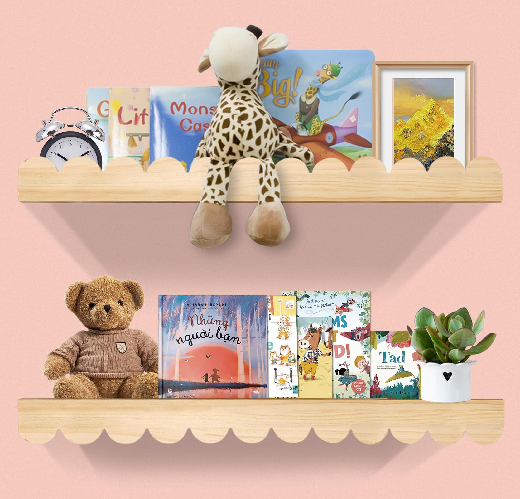 PHOENANCEE Estantes festoneados para libros, estantería de guardería para pared, estantes flotantes de madera para niños, organiza