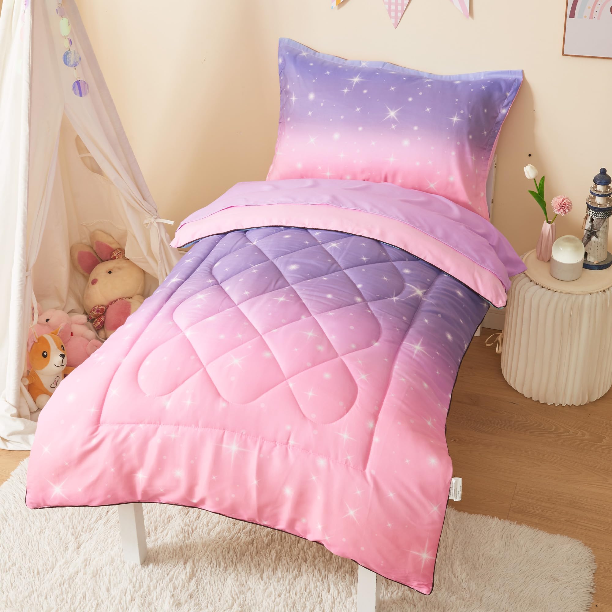 Juego de ropa de cama para niñas de 4 piezas rosa y morado degradado con purpurina para bebé, juego de ropa de cama para cuna de b