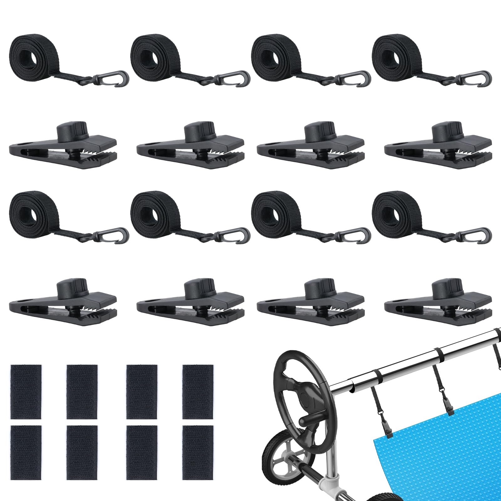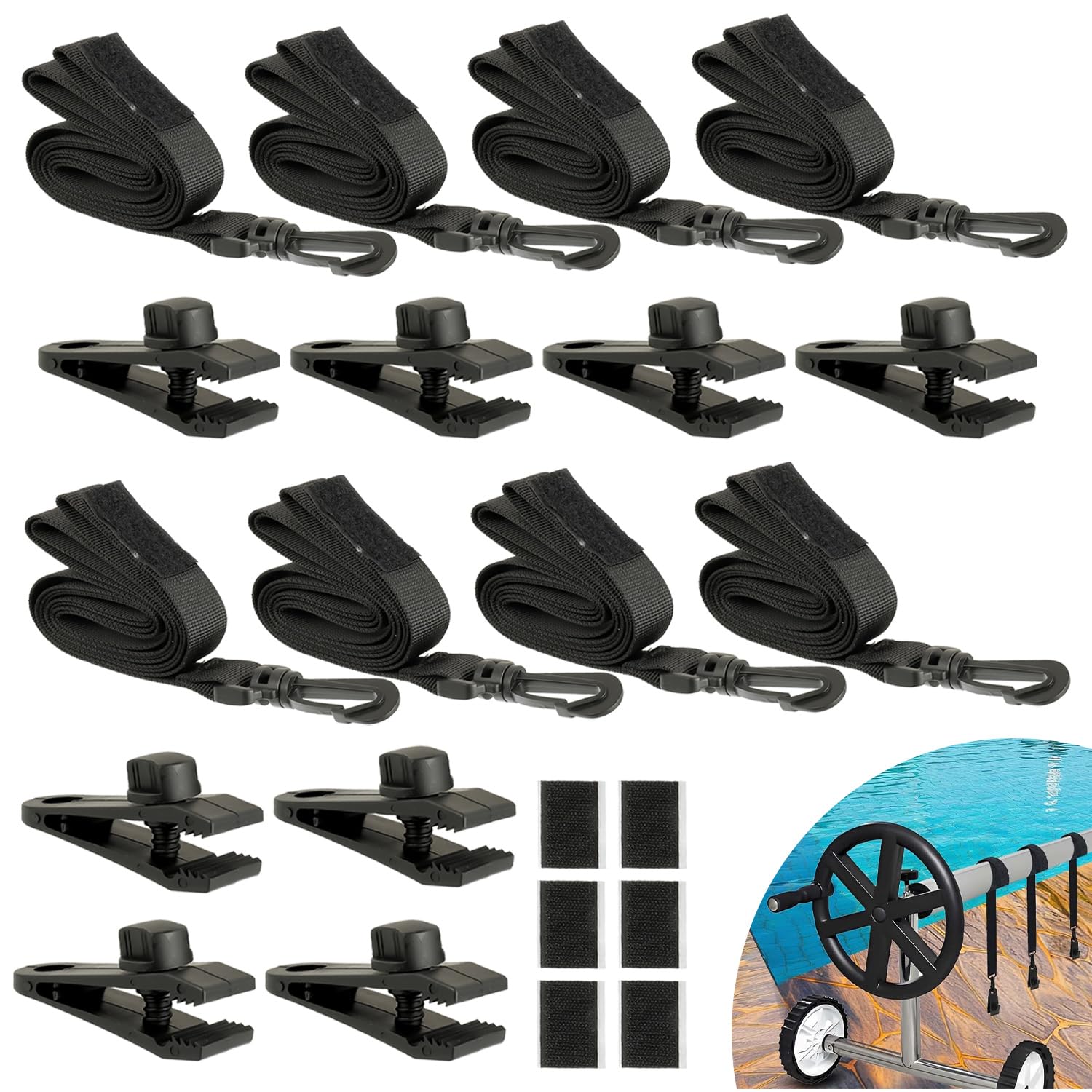 24-Pack Solar Cover Reel Attachment Set for Inground Pools, Includes 8 Straps with Hooks, 8 Durable Clips, and 8 Hook-and-Loop Fas