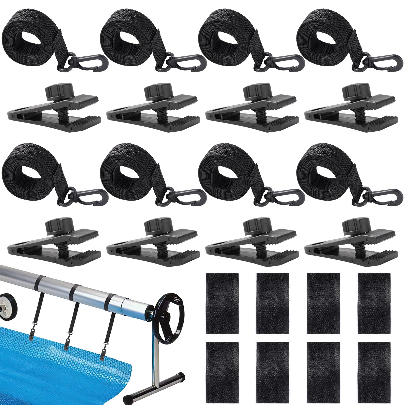 24 Pcs Pool Solar Cover Reel Attachment Kit, Pool Reel Straps Kit Pool Solar Cover Straps and Clips, Solar Blanket Straps Kit Incl