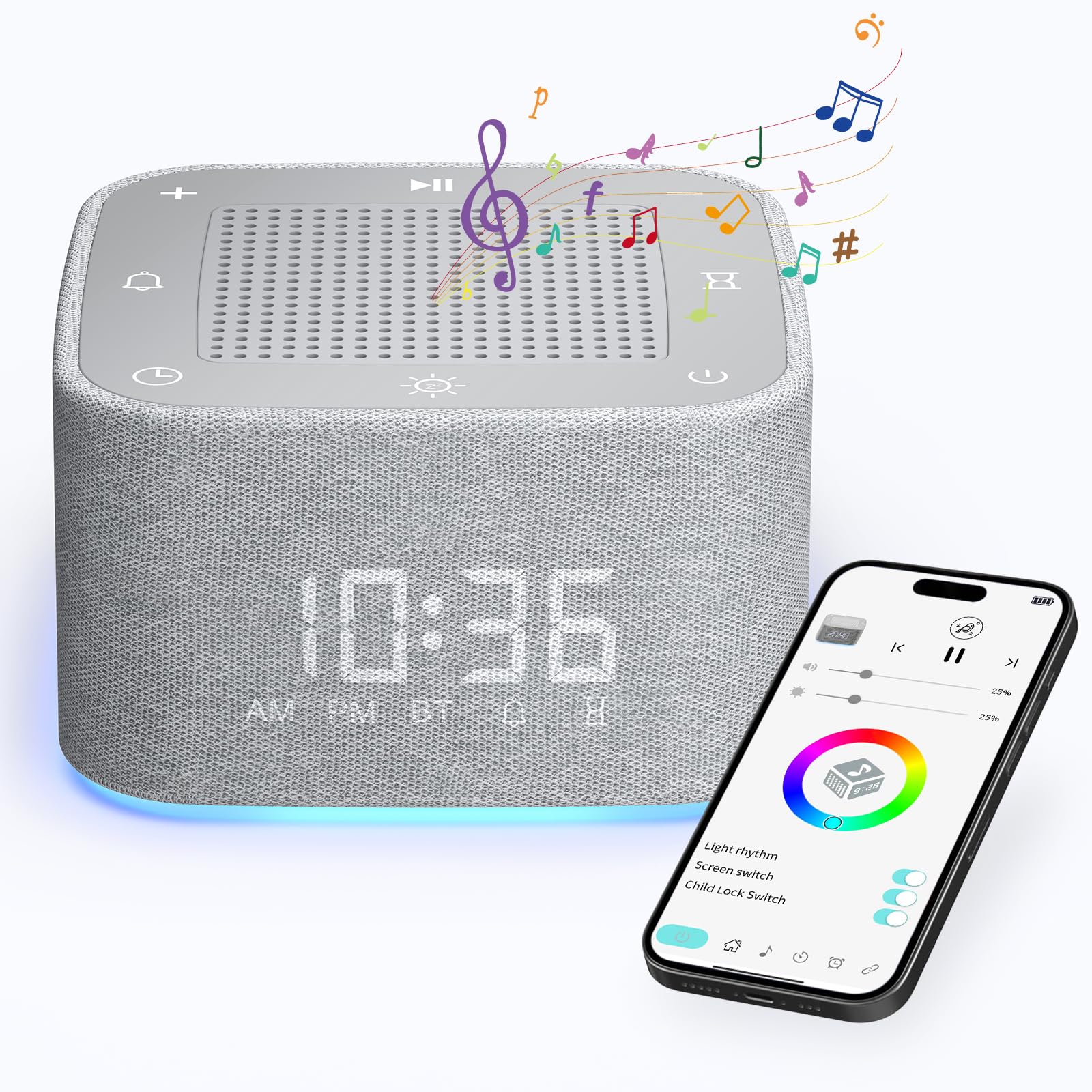 FUNYKICH Máquina de sonido de ruido blanco 3 en 1 con 32 sonidos, reloj despertador y luz nocturna, relojes despertadores para dor