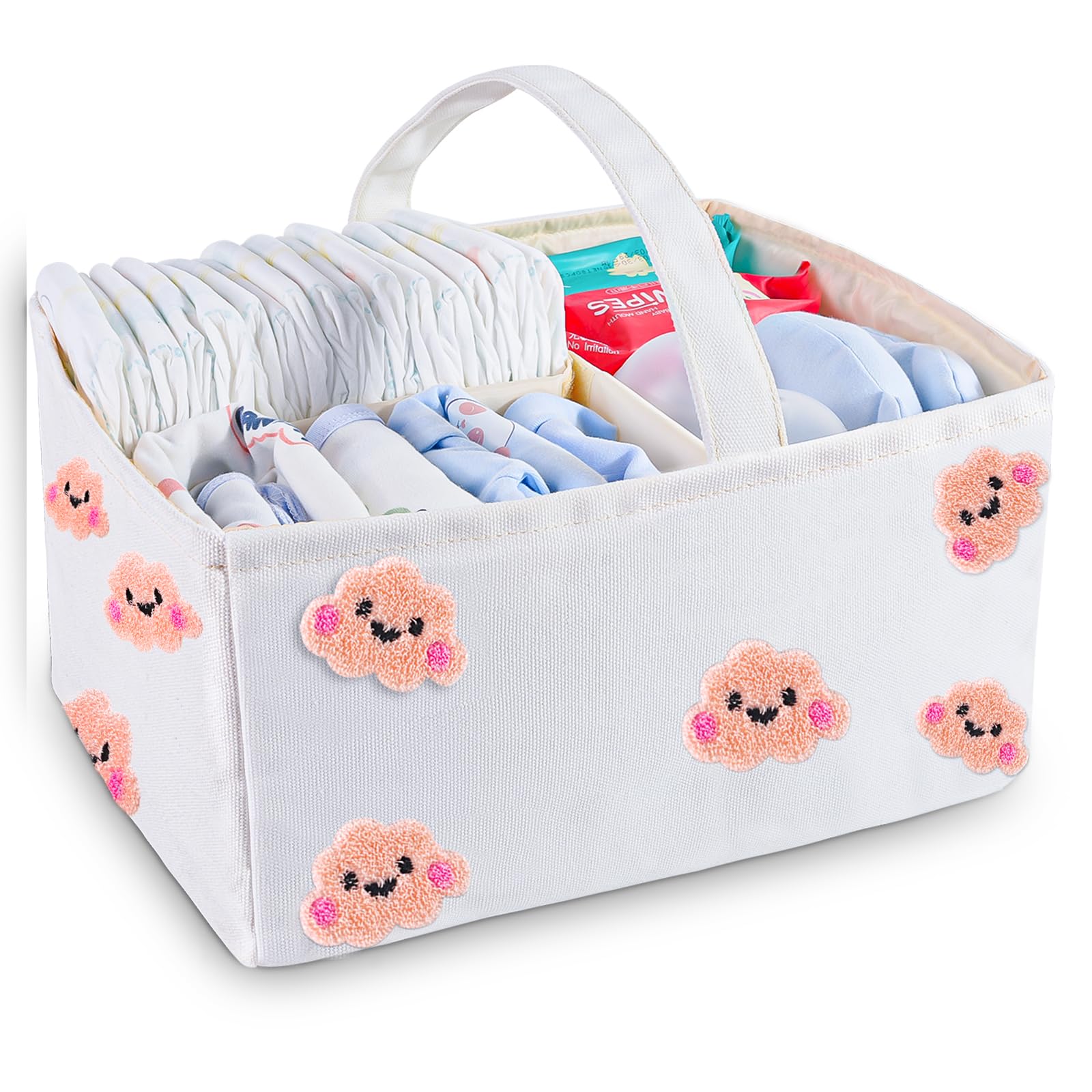 Baby Diaper Caddy Organizer with Handle – Durable Canvas Storage Basket with Cloud Embroidery, Portable Nursery Organizer for Newb