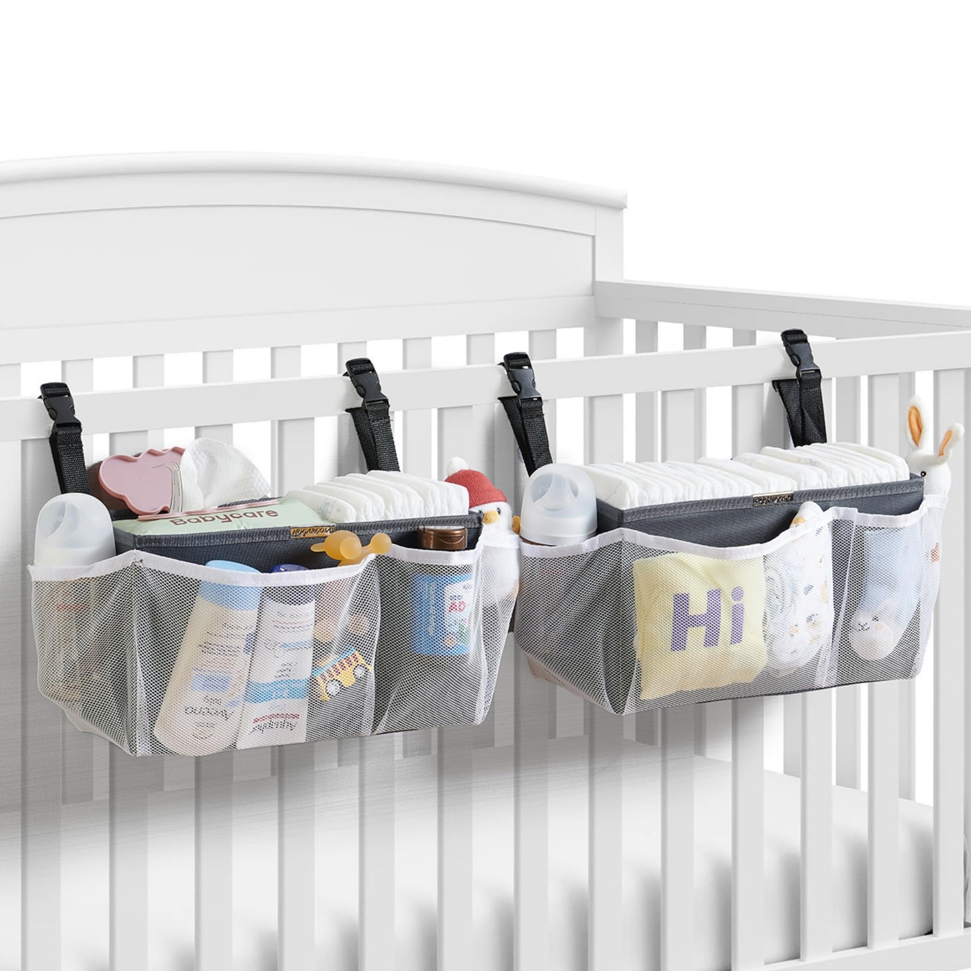 Organizador de pañales lateral para cuna con soportes para botellas, bolsillos de almacenamiento de malla, color negro