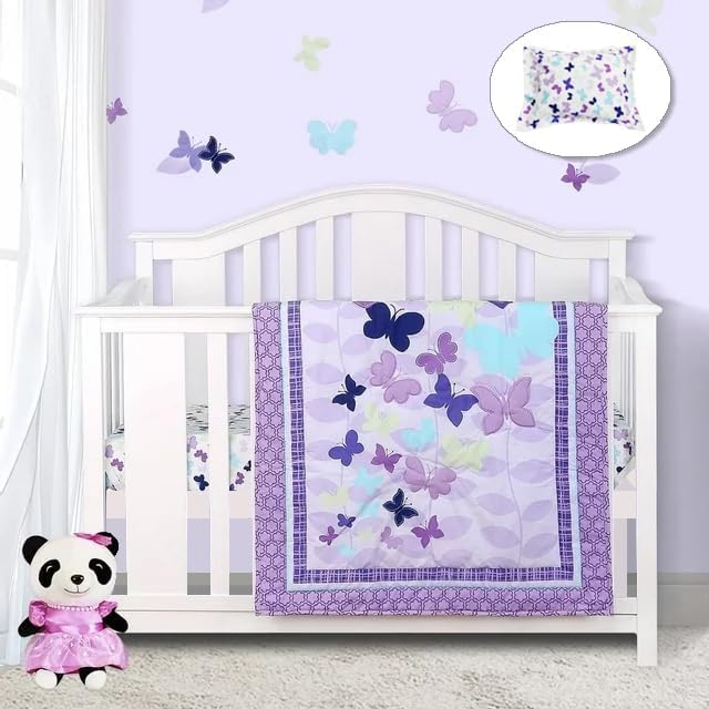 Juego de ropa de cama de 3 piezas de algodón con mariposas, juego de cuna morado para niñas pequeñas, juego de ropa de cama de mic