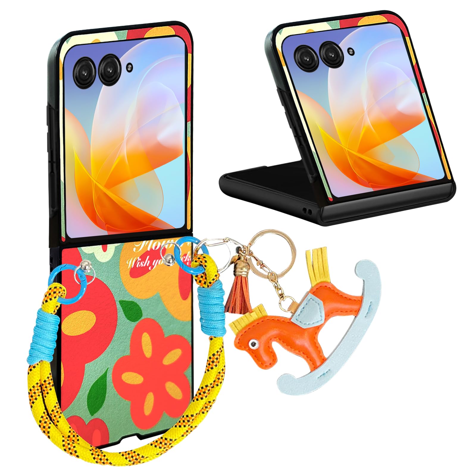 Funda para teléfono Motorola Razr Plus 2024/Razr 2024, funda de cuero con patrón de flores de color dopamina, correa de mano naran