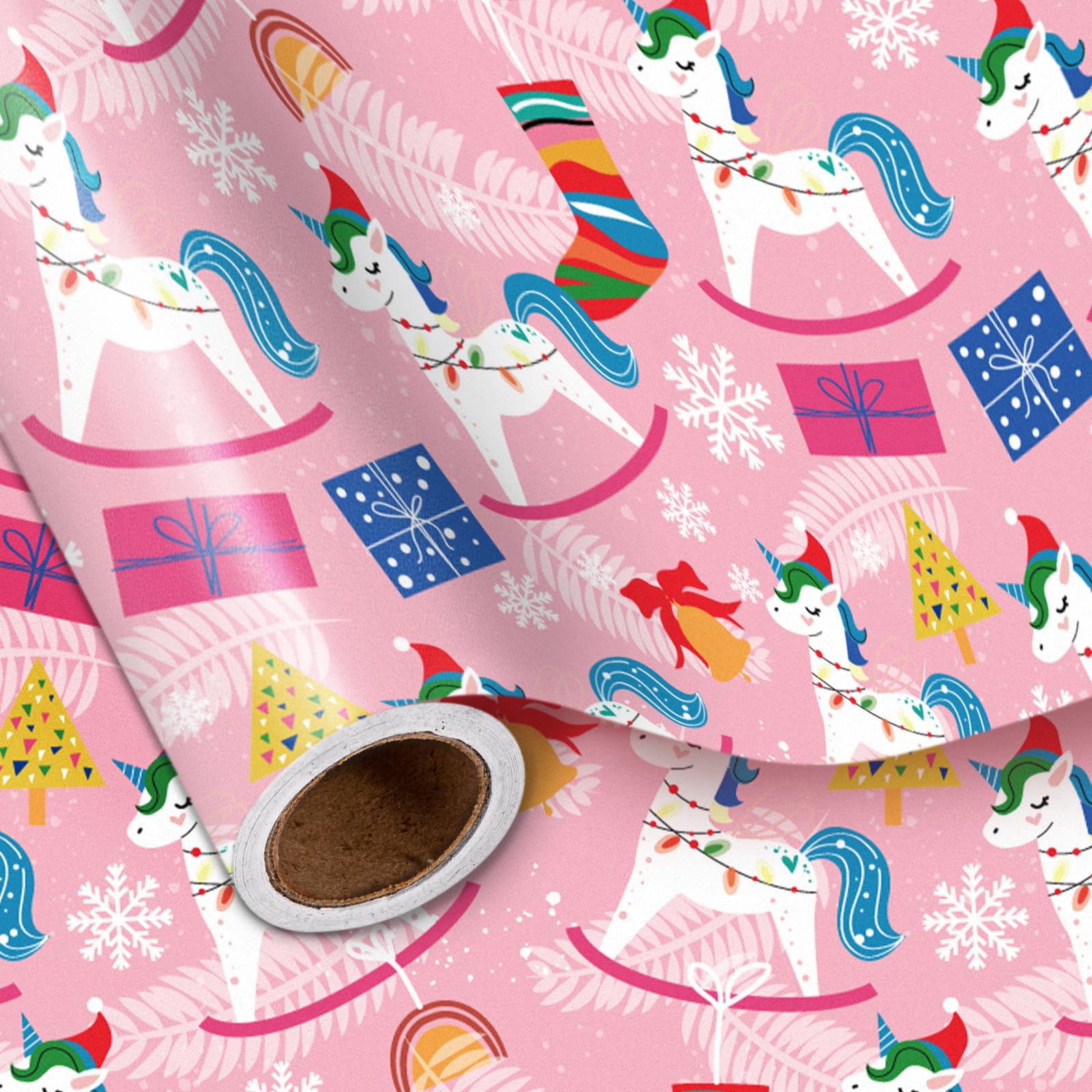 LeZakaa Unicorn Christmas Wrapping Paper Roll for Girls Kids Women, Pink Unicorn Rocking Horse Snowflakes Festive Design, for Birt