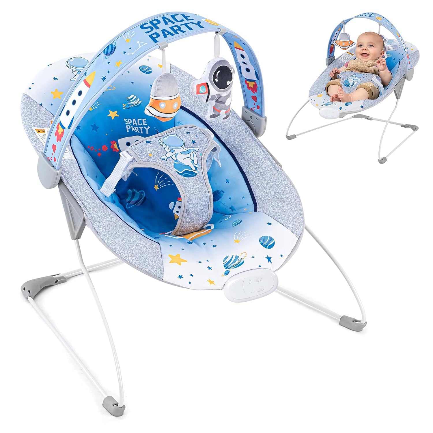 Bright Starts Comfy Baby Bouncer Soothing Vibrations – Asiento para bebé, música, barra de juguetes extraíble, 0-6 meses hasta 20