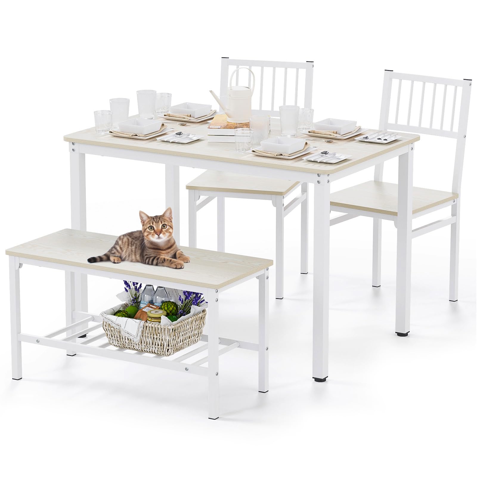 Giantex Juego de mesa de comedor para 4, mesa y sillas de cocina de 43 pulgadas, banco de comedor con marco de metal y estante de