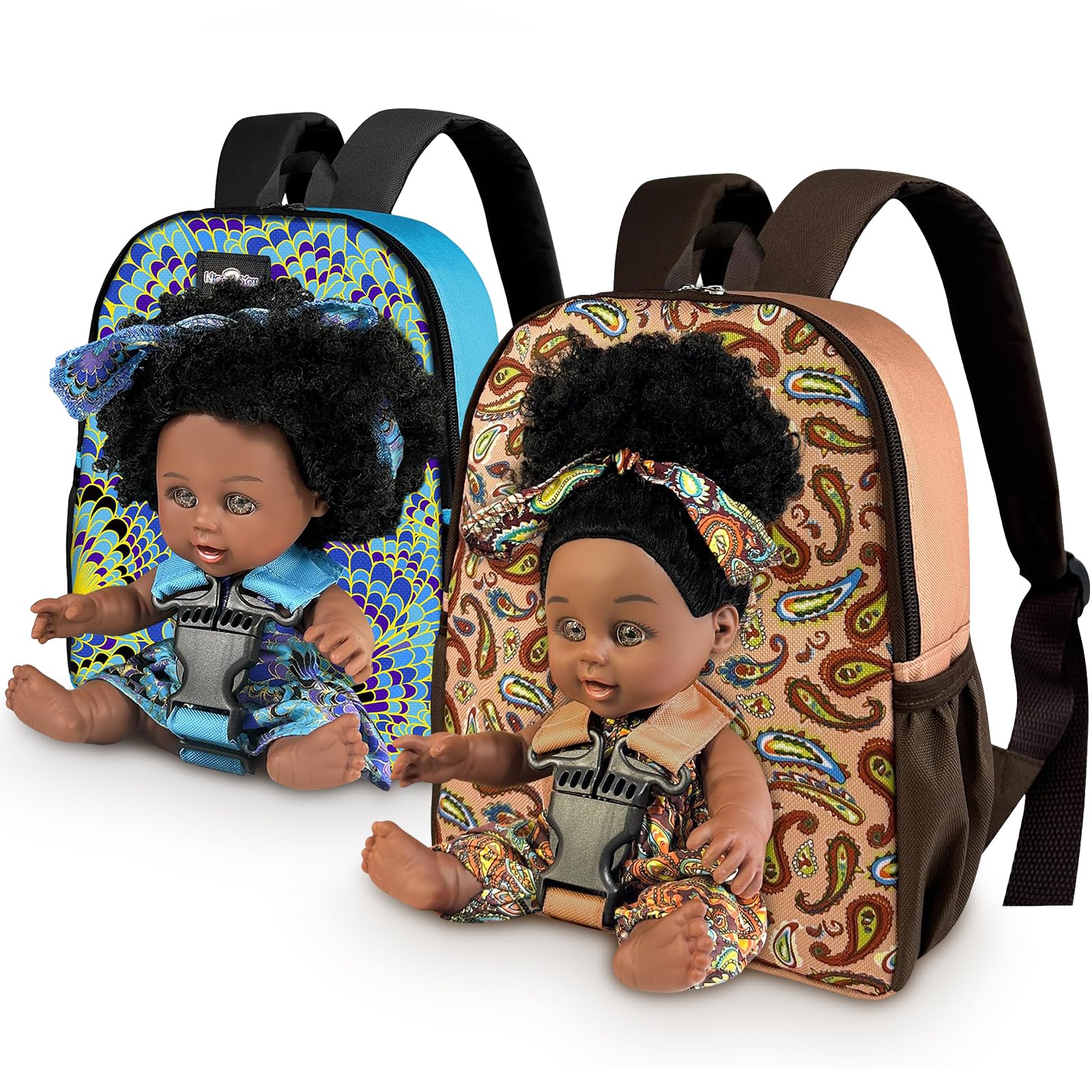 Paquete de 2 muñecas negras en mochila para llevar, muñeca africana americana de 10 pulgadas para niños pequeños y niños de 2, 4,