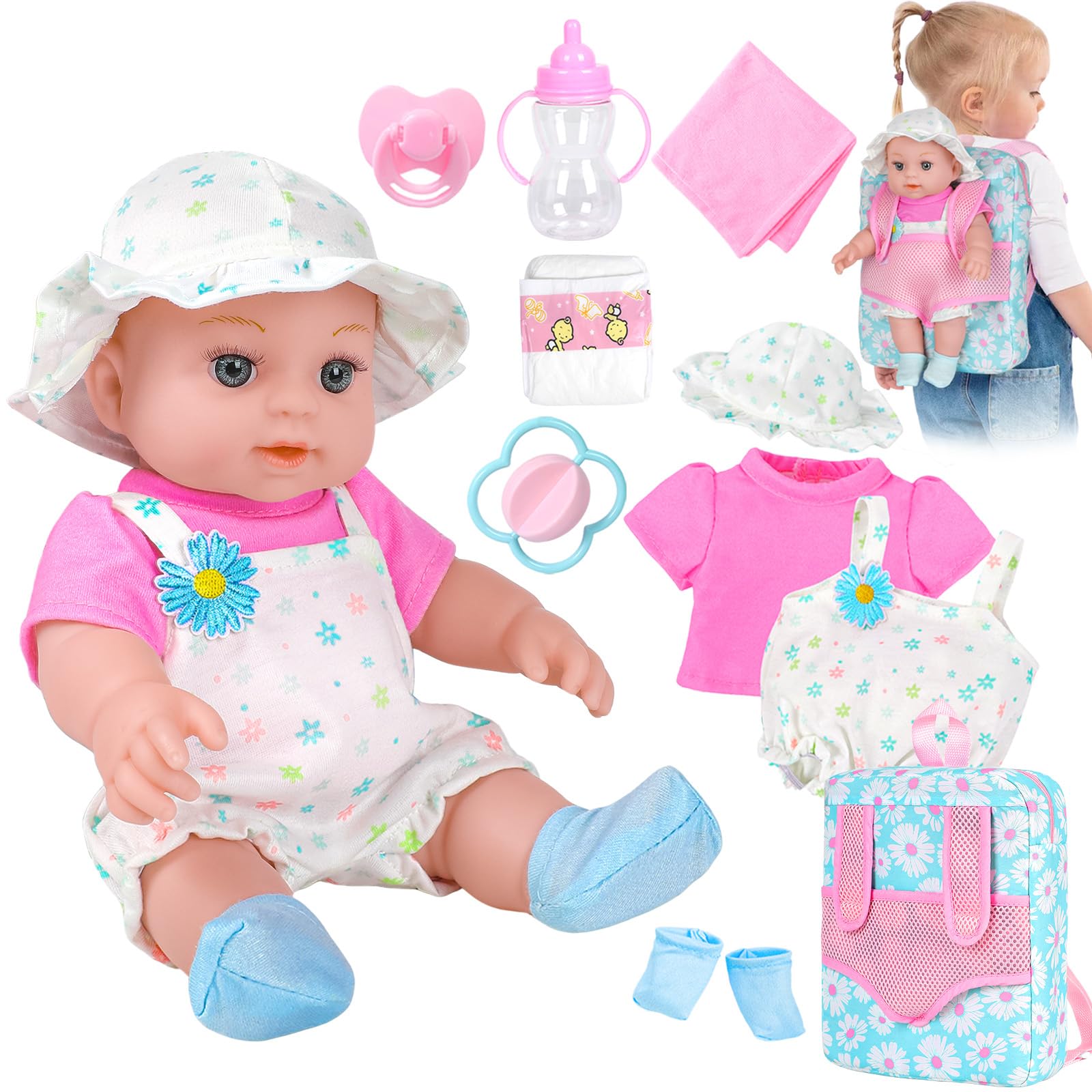 Gift Boutique – Muñeca de bebé de cuerpo suave con ropa en mochila para llevar, muñeca de bebé infantil de 12 pulgadas con accesor