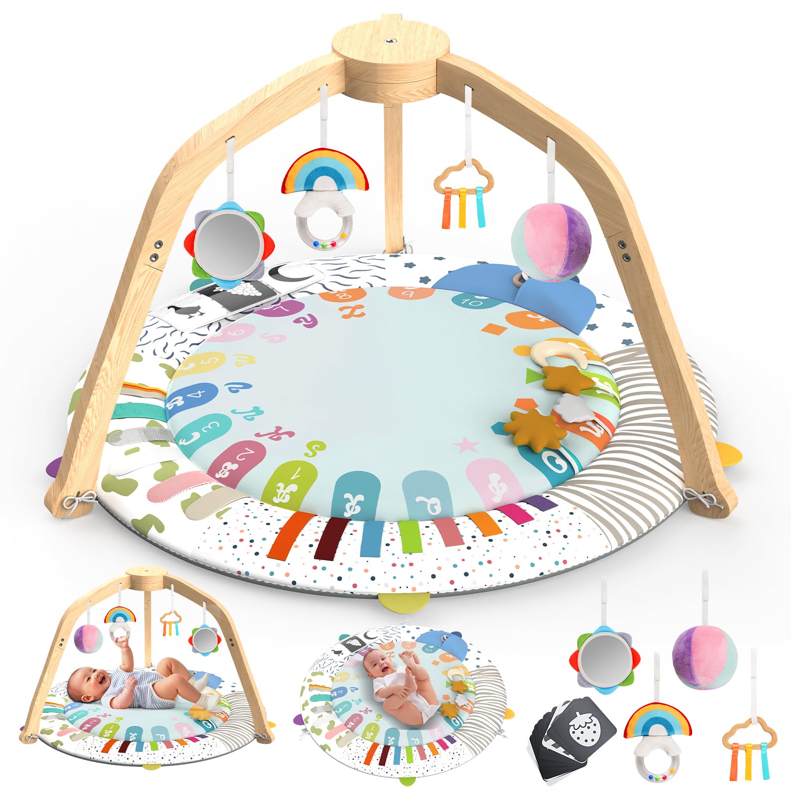 Razee Alfombra de madera para jugar al gimnasio del bebé, gimnasio para bebés con 6 juguetes sensoriales colgantes, gimnasio plega