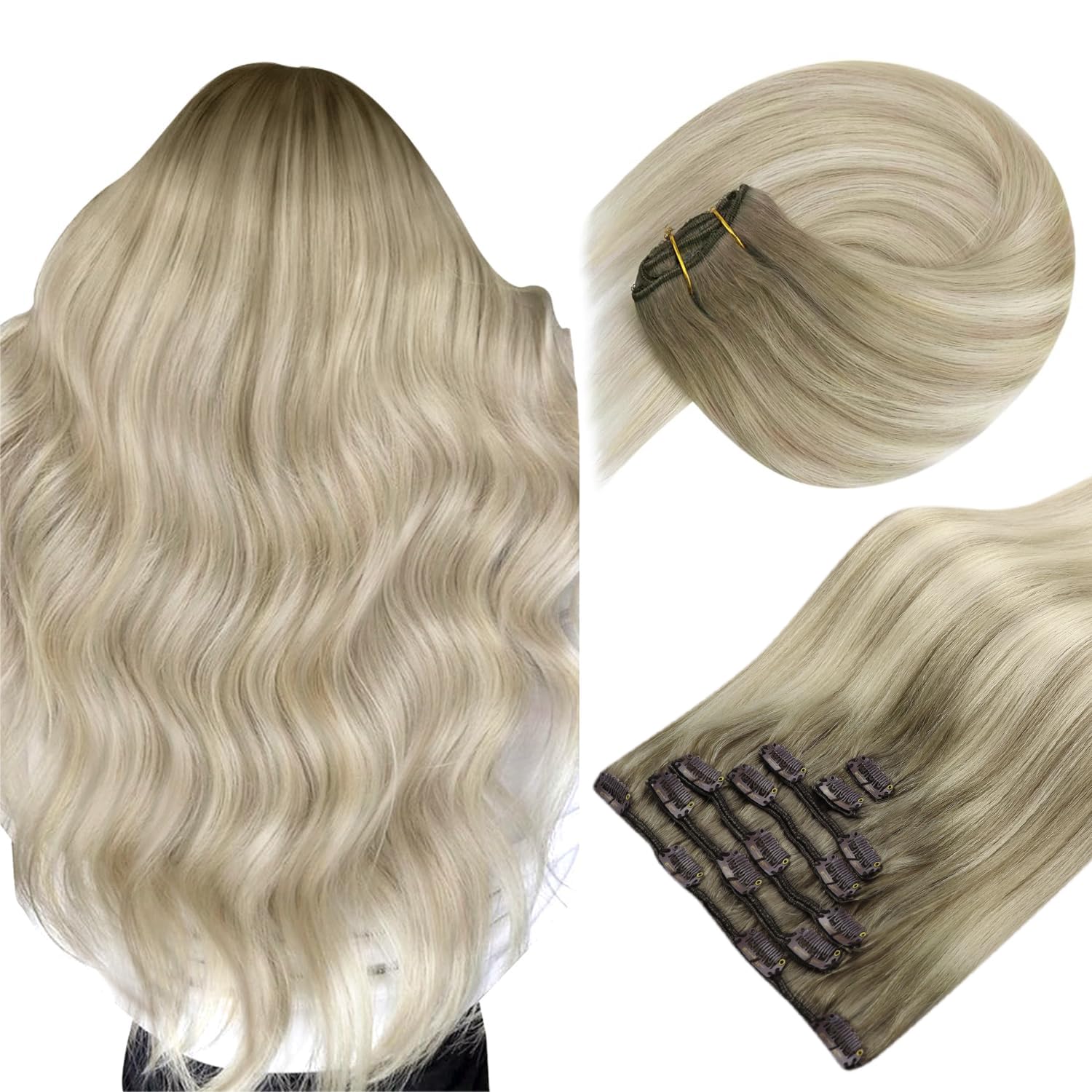 Sunny – Extensiones de cabello humano con clip, de 4.76 oz, color rubio ceniza, balayage, rubio platino, extensiones de cabello hu