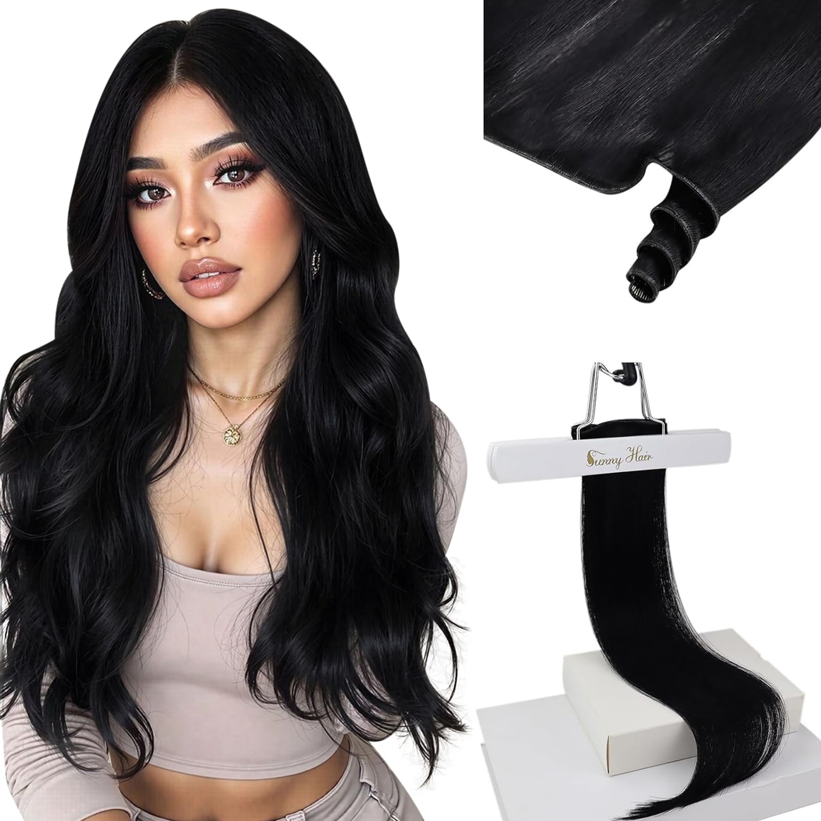 Sunny – Extensiones de cabello humano virgen con trama, extensiones de cabello humano real, atadas a mano, color negro, 0.88 oz (2