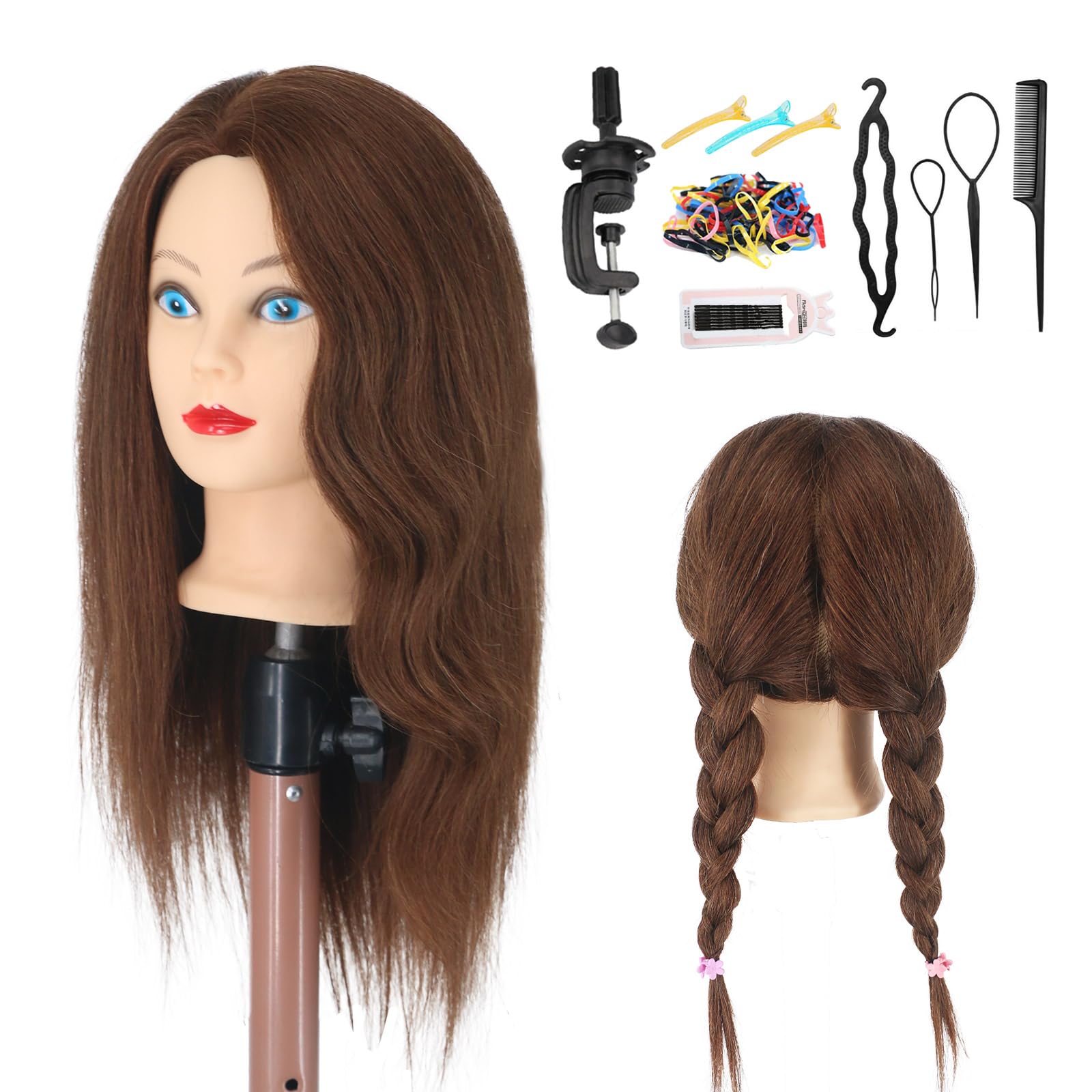 Cabeza de maniquí de 20 pulgadas con soporte, cabeza de maniquí de cabello real para trenzar, cabeza de muñeca de maniquí de cosme