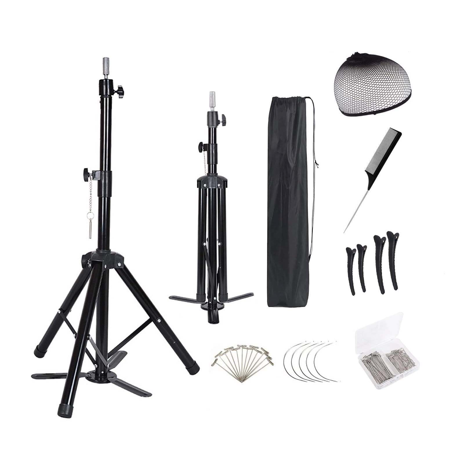 Klvied Soporte para peluca, trípode ajustable, soporte de cabeza de maniquí con panel de pie, cabeza de peluca de metal reforzado