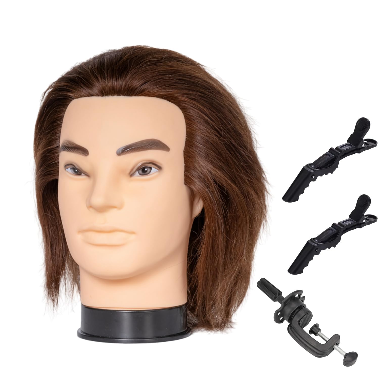 Cabeza de maniquí masculino 100% cabello humano, cabeza de maniquí de cosmetología con soporte, cabeza de maniquí de cabello human
