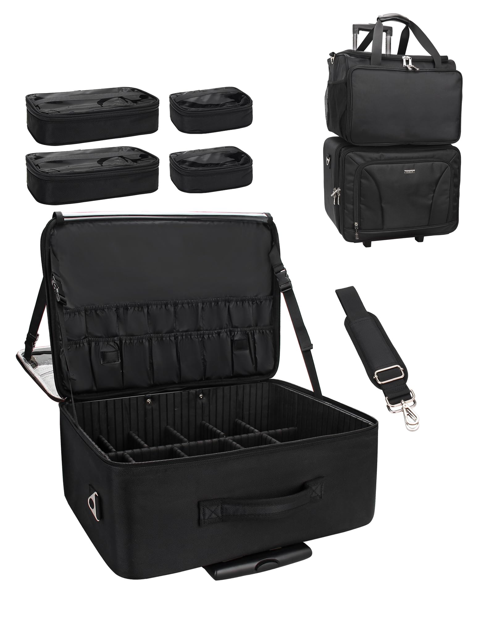 MONSTINA Estuche de maquillaje con ruedas con cuatro bolsas pequeñas de maquillaje + bolsa de peluquería profesional, estuche de m