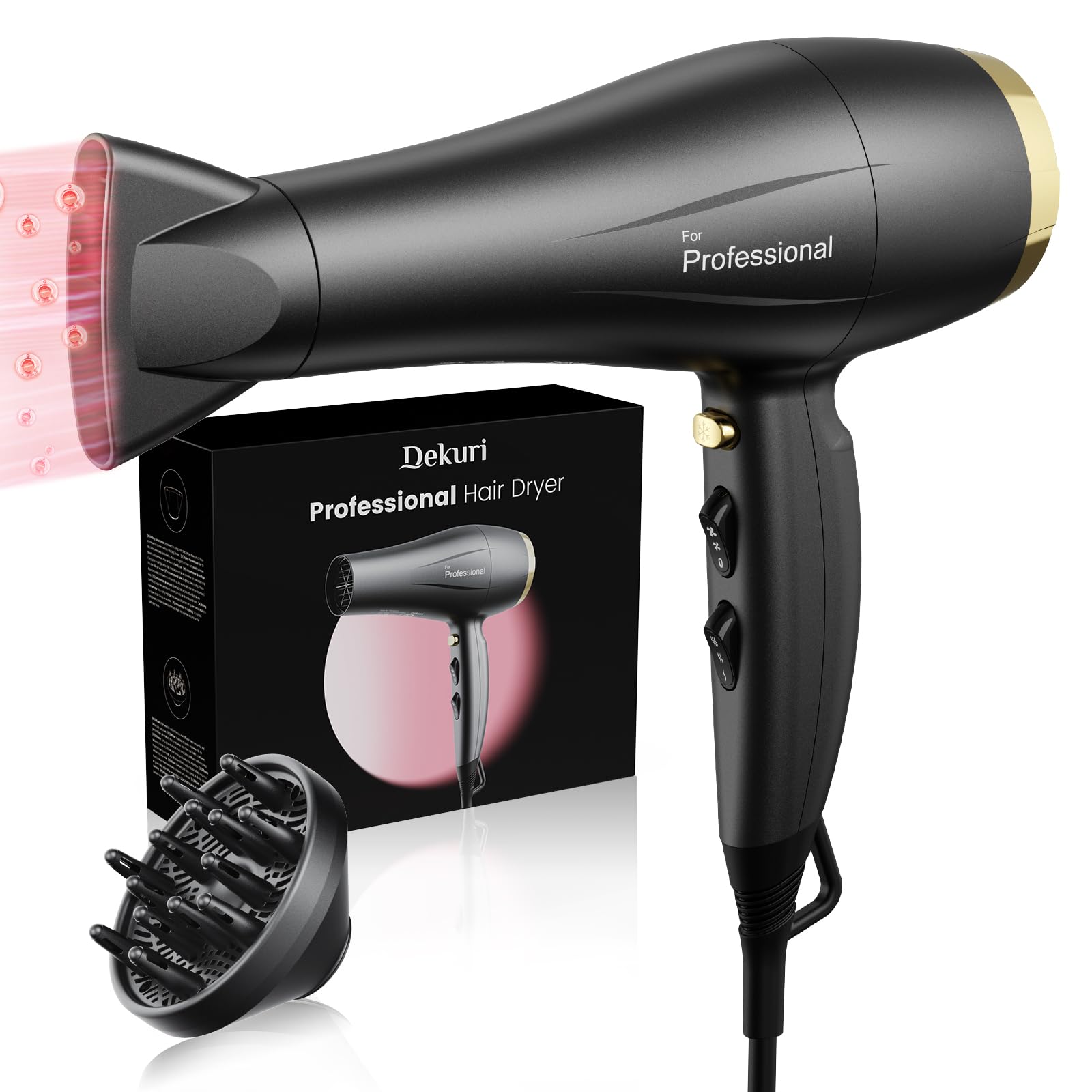 Secador de pelo con difusor, secador de pelo profesional con boquilla, 2 velocidades y 3 ajustes de calor, botón de disparo frío,