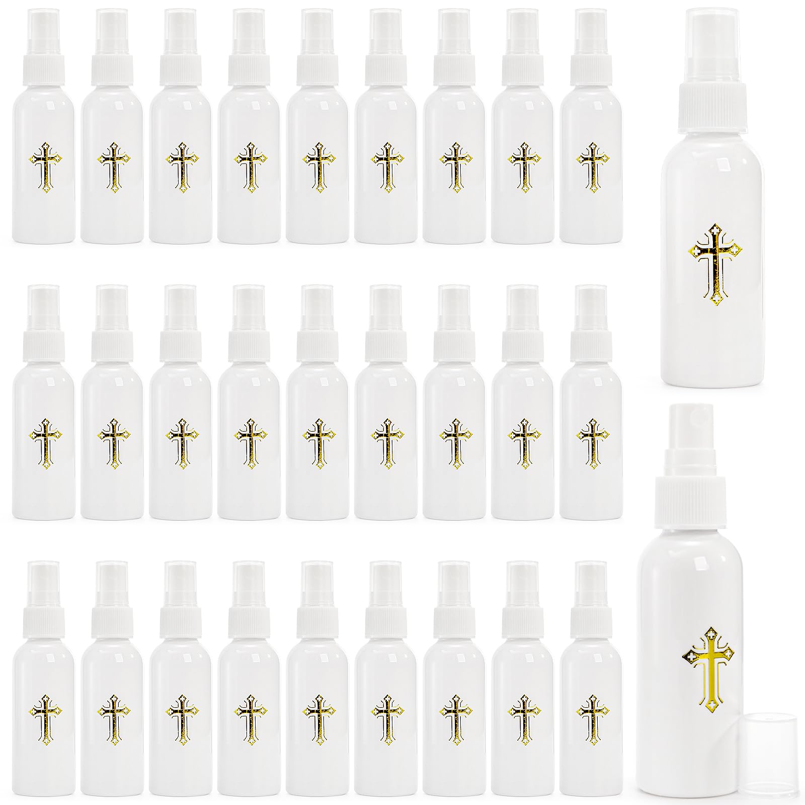 Hiceeden 30 botellas de aerosol de 2.1 onzas líquidas con patrón de cruz dorada, recipiente de agua católico de plástico vacío, bo