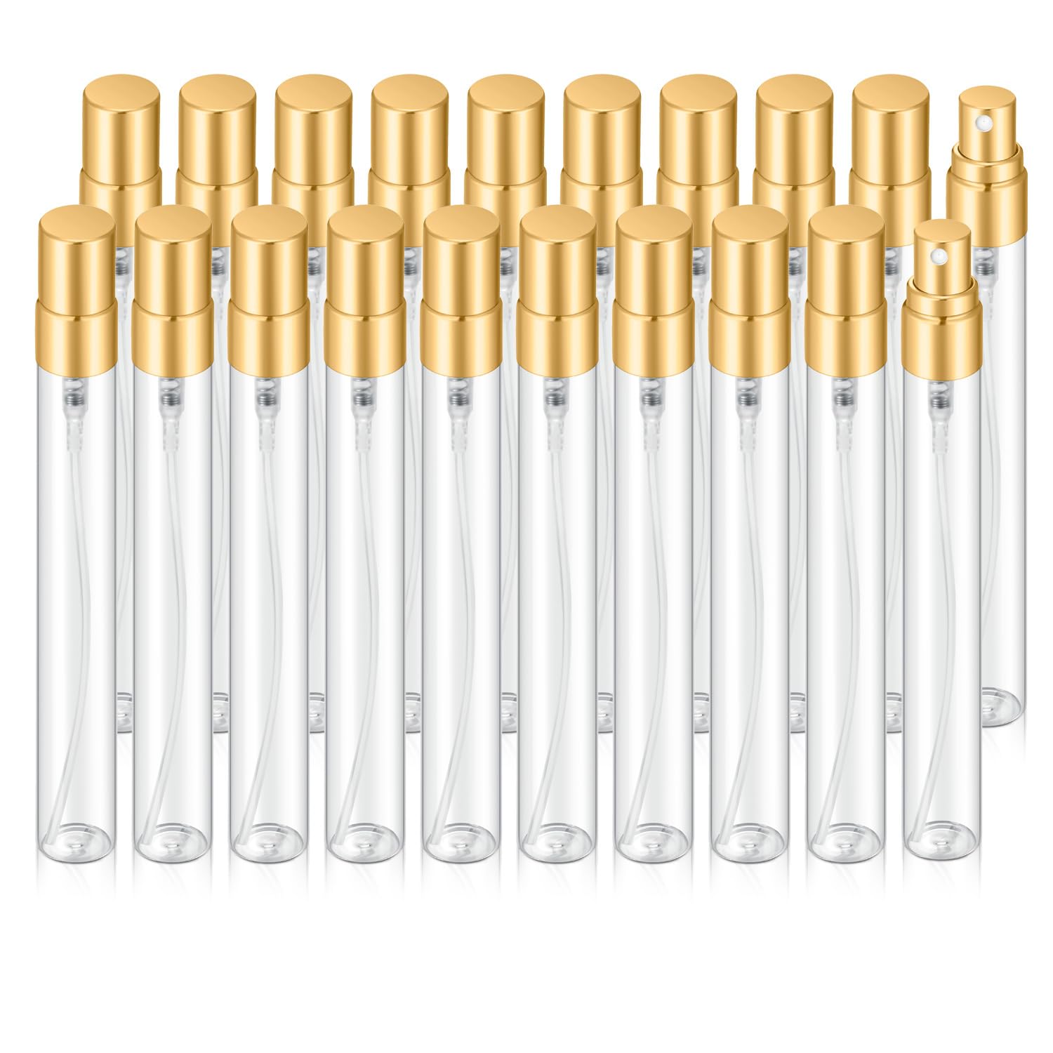 20 botellas vacías de vidrio transparente de 0.3 fl oz, recargable, mini atomizador de perfume, botella de muestra de viaje con bo