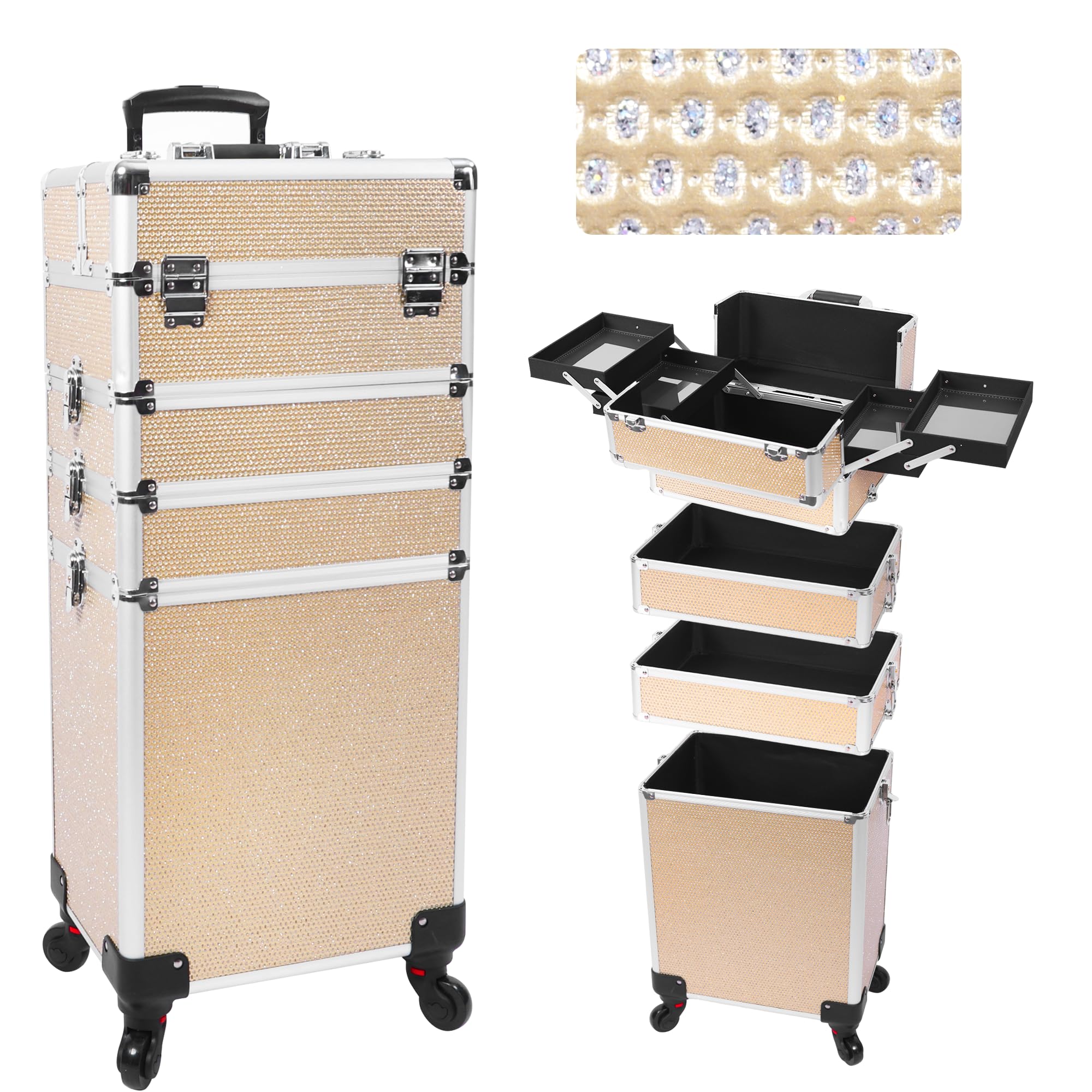 Estuche de maquillaje profesional con ruedas, estuche de tren de maquillaje 5 en 1, carrito de maquillaje cosmético, estuche de co