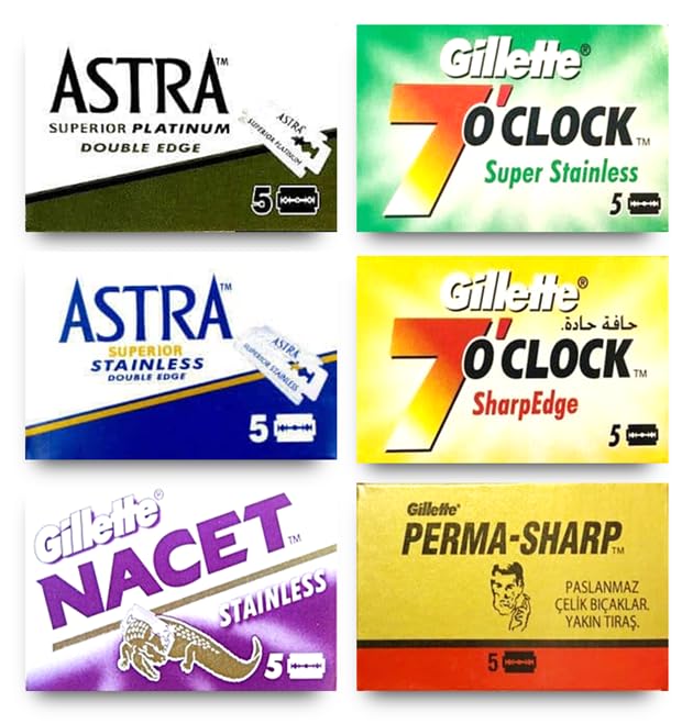 Juego de cuchillas de afeitar premium: Astra, Gillette 7 en reloj, Permasharp, Nacet – 30 cuchillas en total