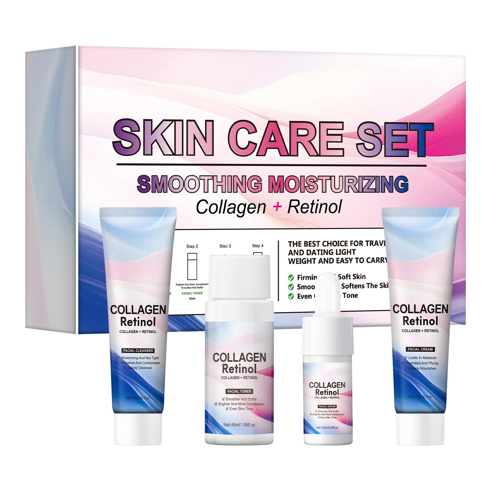 Juego de cuidado de la piel con retinol de colágeno, 4 piezas antienvejecimiento con limpiador, suero, tóner y crema, kit de cuida