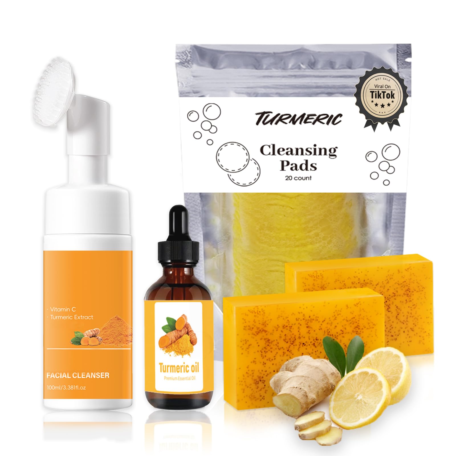 Juego de 4 piezas de lavado y cuidado de cúrcuma, jabón facial de cúrcuma con cepillo, almohadillas faciales exfoliantes, barras d