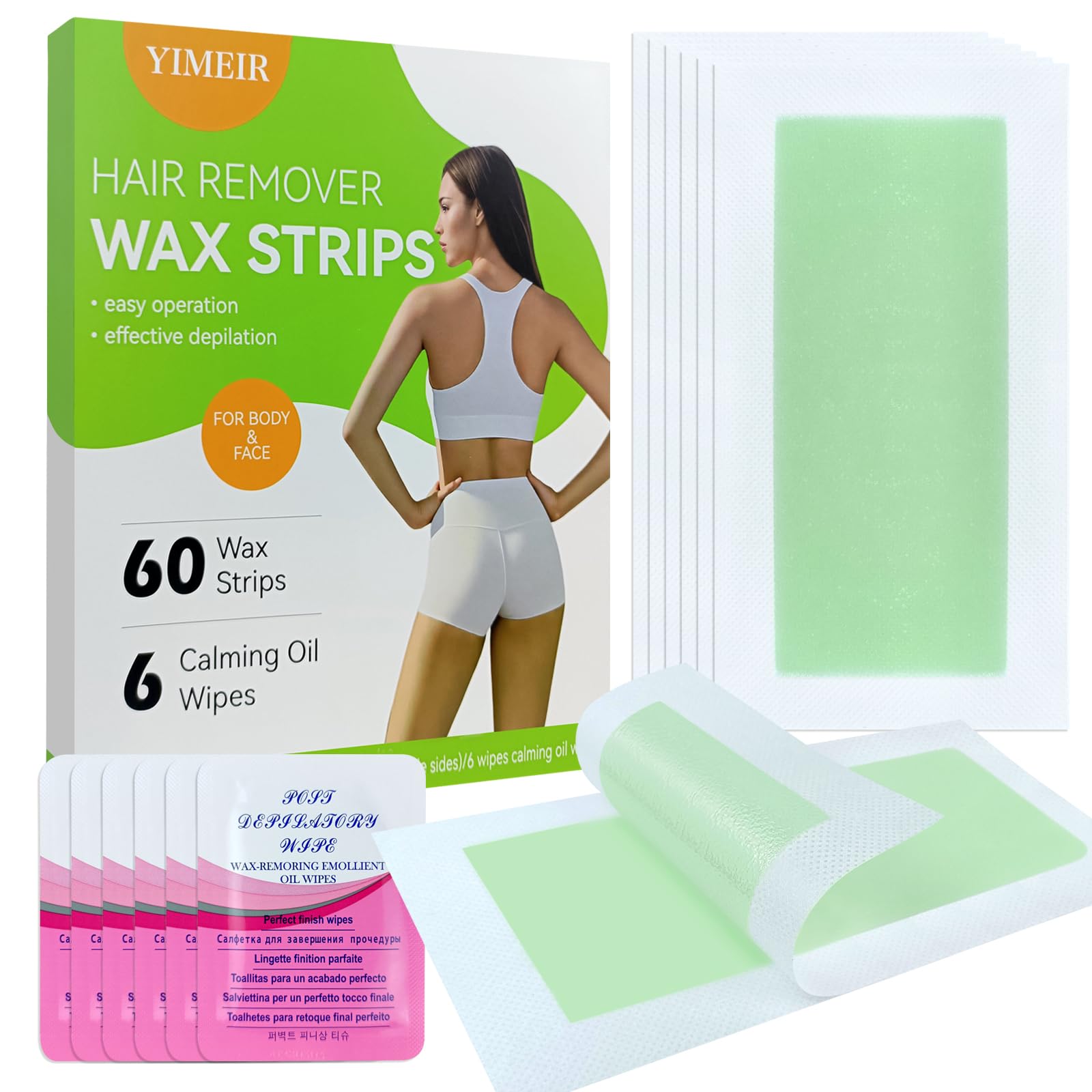 Tiras de cera para depilación – Indolorosas, rápidas y duraderas | 72 unidades (48 cuerpos + 24 caras) con 8 toallitas | No necesi