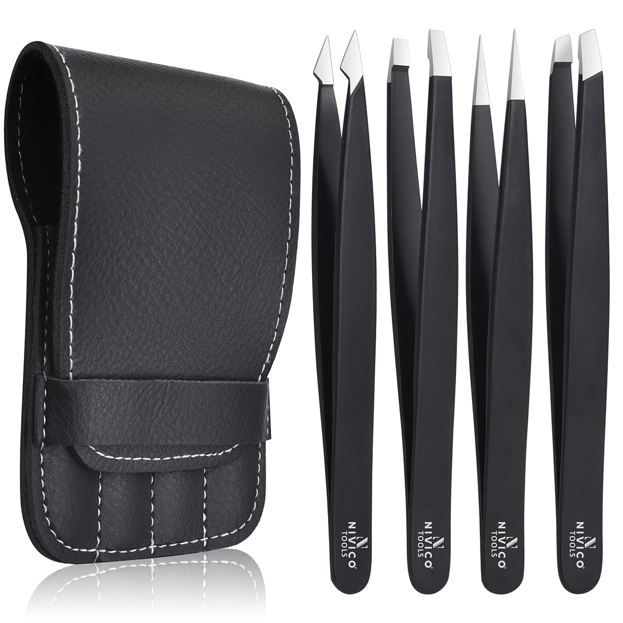 NIVICO – Juego de pinzas con bolsa de cuero, pinzas profesionales de acero inoxidable para cejas, depilación facial encarnada de p