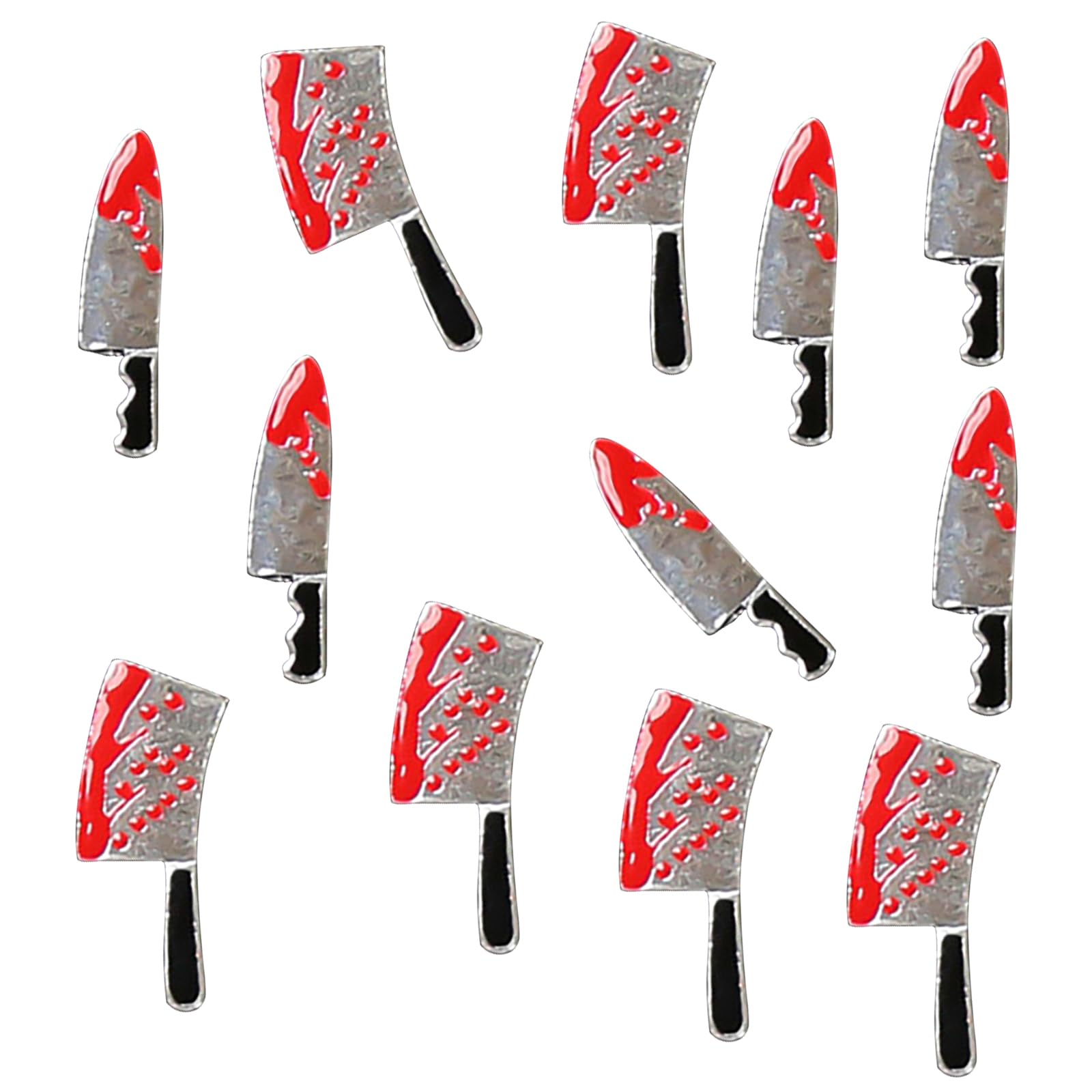 Dijes de uñas de cuchillo sangriento de Halloween, gemas rojas plateadas, suministros de cocina metálicos 3D, joyería gótica afila