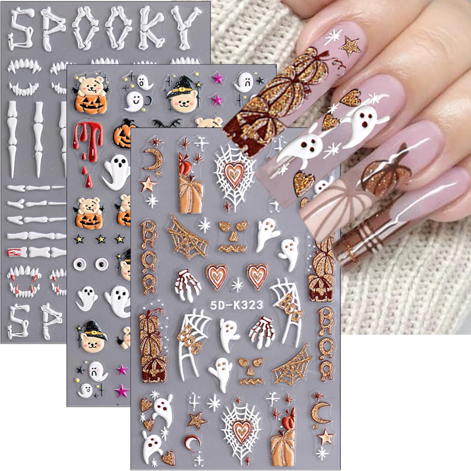 Calcomanías 5D para uñas de Halloween, lindas calcomanías de fantasma, calcomanías autoadhesivas, estrellas, luna, calabaza, oso,