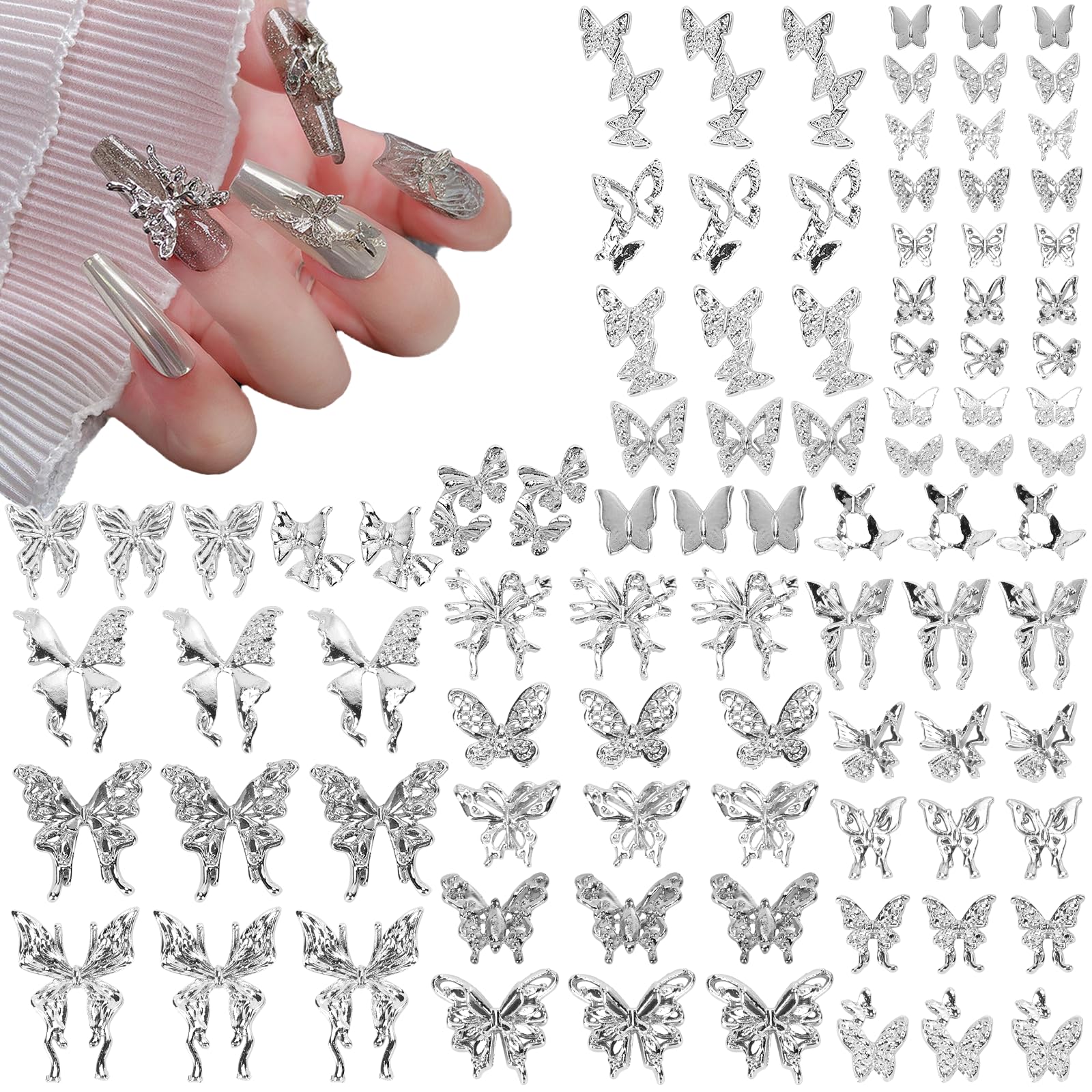 Dijes para uñas de mariposa, 60 dijes de mariposa plateada, aleación Y2K, decoración de uñas, accesorios para manualidades
