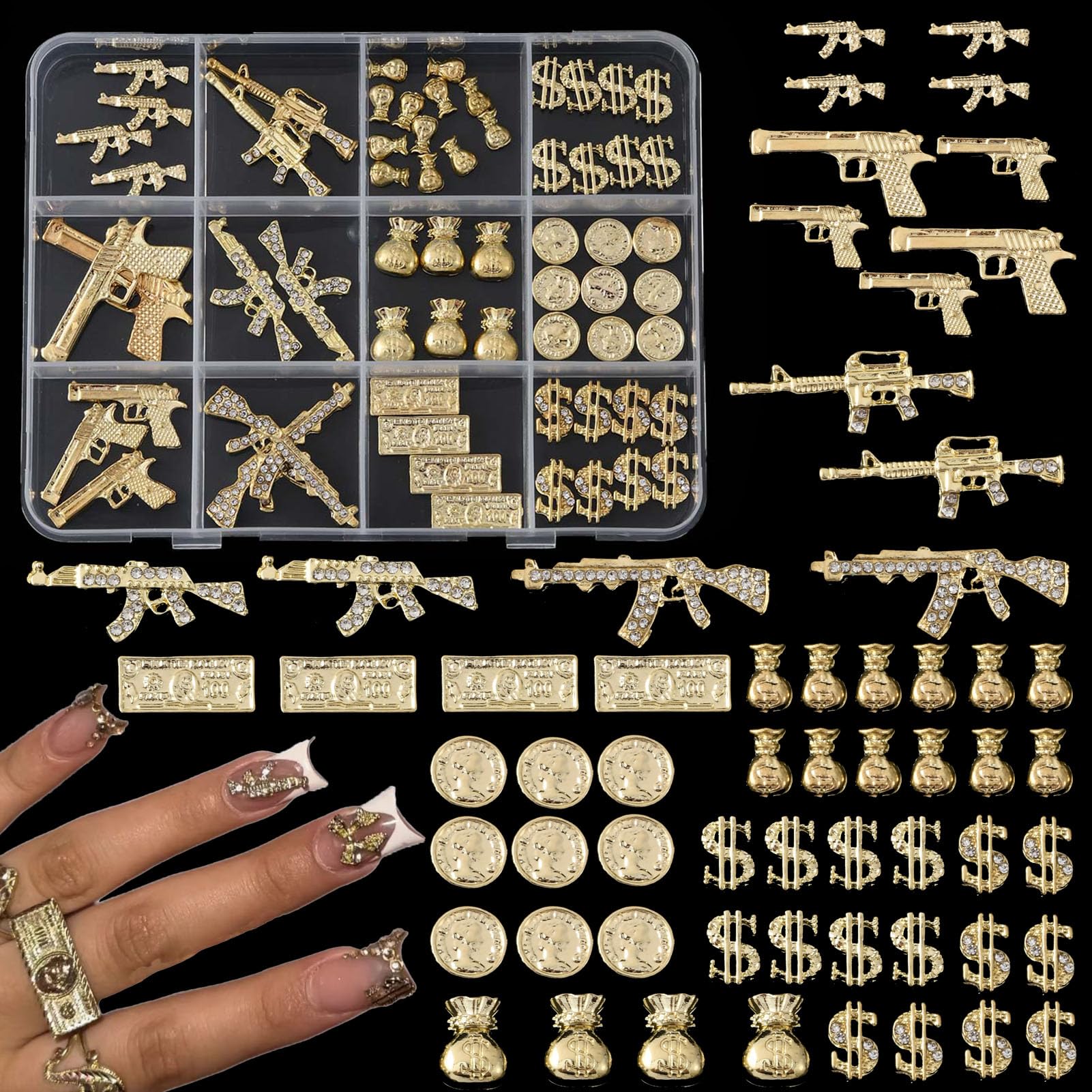 Juego de 62 dijes de uñas 3D para uñas de aleación, juego de decoración de uñas con dólar dorado, pistola y moneda, piedras de uña