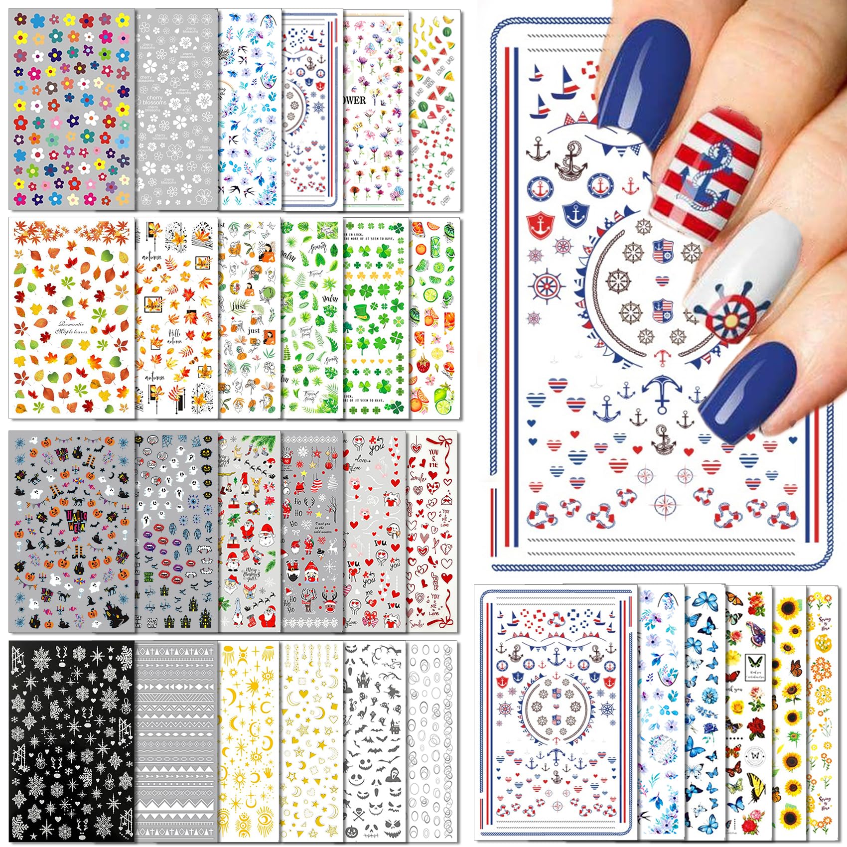 30 hojas de calcomanías de arte de uñas para todas las fiestas, paquete variado de calcomanías de uñas de temporada, diseño colori