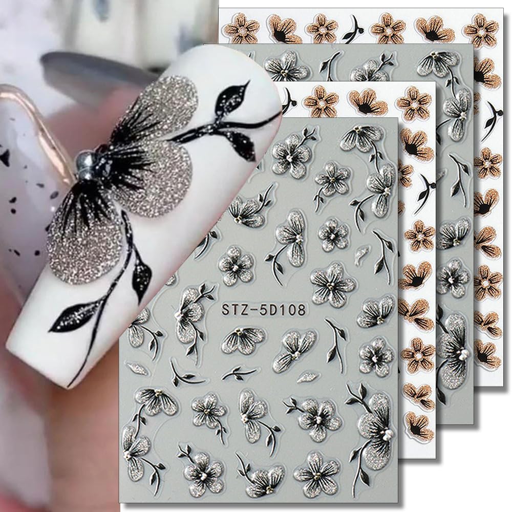 Calcomanías de uñas de flores con purpurina para mujer, calcomanías de uñas 5D de flores negras y plateadas para suministros de ar