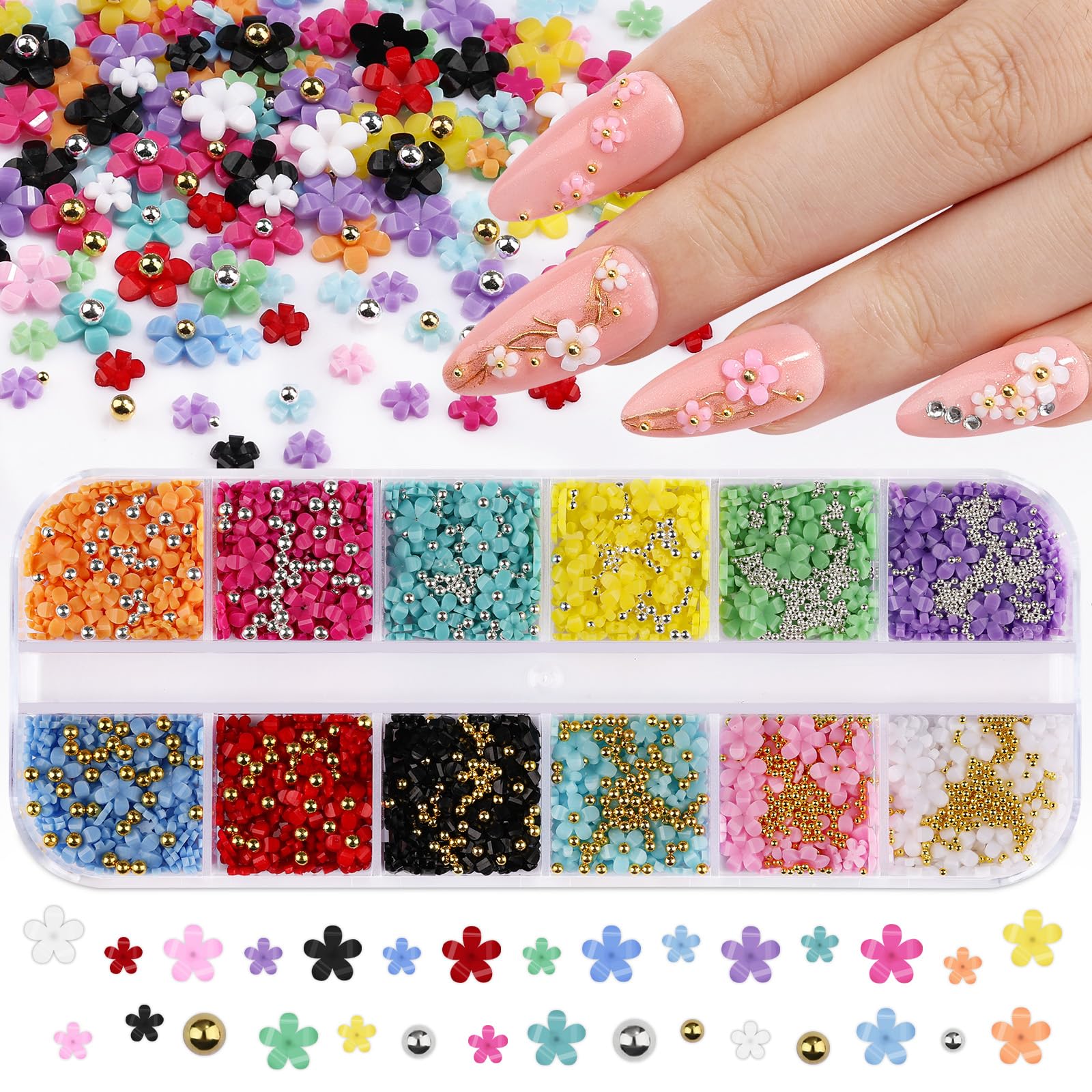 Dijes de uñas de flores coloridas 3D con cuentas de caviar de metal dorado y plateado, pétalos de flor de cerezo, dijes de arte de